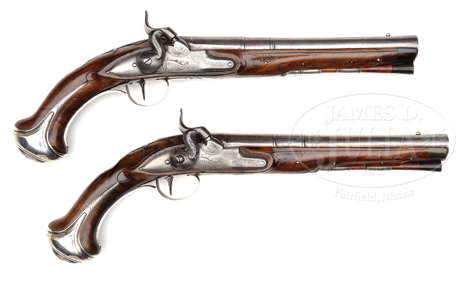 INTERESTING PAIR OF 18TH CENTURY SILVER MOUNTED CONVERTED TO PERCUSSION JAMES FREEMAN PISTOLS. SN NSN. Cal. .665 Bore diameter. 8-3/4″ Swamped bbls have three step wedding band transition to nicely flared muzzles. Bbls are nicely converted to percussion with welded-in bolsters. Tops of bbls are marked “Freeman London”, and have London proofs and bbl makers mark “F” under a crown at left rear. Round bodied lockplates are fitted with broad serpentine percussion hammers, and are engraved “Freeman” in scroll surrounded device. Dense European walnut stocks have incised carved “moldings” around most metal parts, and some relief carved acanthus scroll behind top tangs. Un-hallmarked, high relief silver mounts include very interesting, macabre side plates with what appear to be severed heads above a broad bladed sword, with draped ribbon tail. A grotesque mask is on heavy knob butts, and a scroll terminated crest plate is at grips Silver trigger guards have fleur-di-lis finials. Stocks are pinned to bbls. Hickory ramrods have horn tips, one has worm tail. A very high quality pair of pistols. CONDITION: Good. Iron and steel parts are cleaned to silver gray. Stocks retain most of an old refinish. Silver is excellent, somewhat softened from cleaning over the ages. Hammer on one lock has been repaired. 4-49609 MGM217 (8,000-12,000)