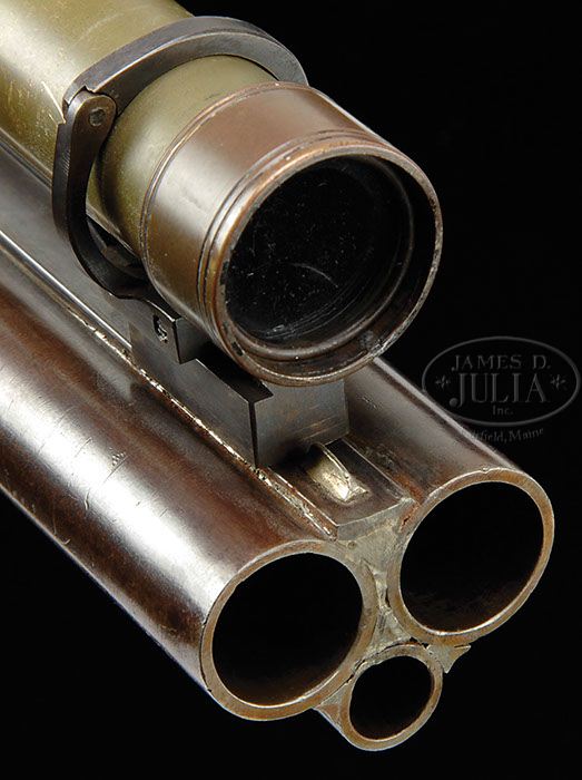 RARE L. C. SMITH – BAKER TYPE GRADE 3 DRILLING WITH SCOPE. SN 1513. Cal. 10 ga x 10 ga x 44-40. 30″ Damascus bbls are engraved “L. C. Smith Maker of Baker Gun Syracuse N. Y. Damascus Steel” on concave top rib, with modified dolls head extension. Bbl flats are stamped with SN. “3” is stamped between lumps on bottom bbl. Action has later style rifle hammer with thumb cocking piece inside trigger guard bow. Action is engraved in typical quality 3 style with well cut scroll flourishes and double line borders. It is unusual in that both sides of action are engraved “L. C. Smith”, with no mention of Bakers patent. Action has nicely filed beads. A pointing setter is engraved on trigger guard bow. SN is at grip. Drilling is sighted with unnumbered flip-up ladder type tang sight, dovetailed through top strap, and inset German silver blade front. An unmarked brass and copper full length telescopic sight is mounted to top rib with elevation and windage adjustments at rear. Dense, lightly marbled and figured European walnut capped pistol grip buttstock measures 14-1/4″ over original checkered hard rubber buttplate, and features multi-point pattern borderless checkering. Matching splinter forend has heavy iron schnabeled tip, and attaches to bottom bbl with captive side nail through oval steel escutcheons. Bore diameter: left -.785, right -.785. Bore restrictions: left -.040, right -.040. Wall thickness: left -.032, right -.026. Weight with scope: 11 lbs. 4 oz, LOP 14-1/4″. CONDITION: Fine. Bbls retain 50% + orig brown, with fair definition to pattern. Action retains a considerable amount orig case hardening color, quite strong where protected, showing some evidence of cleaning and spotting, and is mostly a pewter gray. Stocks retain nearly all of a hand rubbed oil finish with sharp edges softened, checkering re-cut. Stock has been broken through the wrist and repaired. There is a 1/2″ diameter circle on toe line where something has been removed and plugged. Shotgun bores show some light pitting and frosting throughout, some removed dents, but are shiny. Rifle bore is bright, with strong rifling, lightly pitted toward breech. Muzzles and 3″ of top rib show evidence of being re-soldered. Action is tight, locks are crisp. Telescope is nicely toned. Optics are good. No crosshairs are evident. A very scarce high grade American drilling. It is estimated that there were only 1186 Drillings made in all 5 grades. Consignor states that this is one of only 3 known to be produced in no. 3 grade. 4-46248 MGM50 (12,500-17,500)