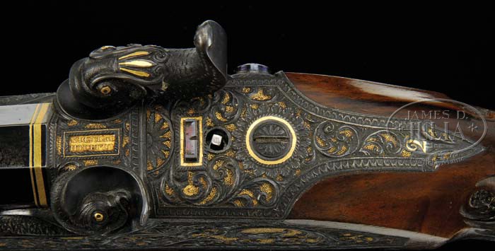 SPECTACULAR CASED PAIR OF ROYALTY QUALITY ULBRICH PERCUSSION TARGET PISTOLS WITH PROVENANCE TO THE PRINCIPALITY OF SAXE-COBURG & GOTHA. SN 1 & 2. Cal. about 45. Spectacular pair of pistols, made identically with 8-1/4″ slightly swamped oct. bbls with poly-rifled bores,tiny dovetailed front sights and elevation key-adjustable rear sights mounted in the top tangs. Top flats of the bbls are inlaid in gold “GEBOHRTER ENGL: STAHL” and they have wide and narrow gold inlaid bands at the muzzles and breech ends. The spectacular breech plugs have shielded nipple recesses with gold blow out plugs on the right sides with matching scalloped recesses on the left sides that have deep relief mythical engraved creatures with gold eyes. The top flats between the two scalloped recesses have rectangular gold cartouches “ULBRICH / DRESDEN”. The top tangs cover the entire tops of the stocks with pointed tails and are marked with gold inlaid “1” & “2” respectively. Lockplates are front action, 3-3/4″ long, slightly curved, with square tails and a most unusual recess for the hammers. Left side of the stocks have a matching side plate identical to the lockplate. They’re mounted in very highly figured, streaky French walnut half-stocks with relief carved dog’s heads at the tips of the forestocks. Bbls are secured with a single key through German silver escutcheons that have scalloped edges and light foliate engraved decoration. Stocks have raised side panels with matching square tails and gracefully curved grips with carved & checkered wrists and fluted oval butts that have matching ebony or hard rubber grip caps that are deep relief carved in foliate patterns with foliate rosettes around the engraved screws. Trigger guards are tapered ovals with hook finger rests and plain long lower tangs. Trigger plates have long decorative finials and they are equipped with single set triggers. All of the metal work is wonderfully relief engraved in delicate intertwined foliate arabesque patterns with gold washed backgrounds. The side plates are engraved with a large scroll that terminates in a mythical dragon’s head and the lockplates are engraved with finer scrolls, one of which terminates in a flower blossom and another in a different mythical creature’s head that resembles a dog. Hammers are matching engraved on the shanks with spectacular dolphin’s heads on the hammer noses that have gold inlaid eyes and gold fins. The hammer spurs are nicely shaded with rough stippling spurs. Top tangs are engraved to match with gold wire inlay outlines around the screw holes and rear sights. Accompanied by their spectacular orig burl walnut veneered presentation casing that is royal purple velvet lined and recessed in the bottom for the pistols, a wonderfully carved stag horn powder flask with carved wooden acorn finial, a fine ebony handled turn-screw, a small round steel oil bottle and a very unusual ebony handled hammer with carved stag horn head and bone rammer tip with sliding crown stag guide. There’s also the original burnished steel sight adjusting key, a beautiful fire blued steel and brass worm and a brass jag. It appears that the cleaning rod and bullet starter are missing. Two covered compartments in the left rear are filled with wax lubricated patches and the right front covered compartment is filled with cast lead balls. Most interesting of the set is the engraved silver oval plate inlaid in the lid of the case and retained with four screws. The plate is engraved with a crown over an old English “E” with a laurel leaf wreath below. These pistols are reported to have belonged to either Ernst the First or Ernst the Second, father and son, who were in their turn Duke of Saxe-Coburg and Gotha. Ernst I ruled from 1826 to 1844. When he died, his son Ernst became Ernst II and ruled from 1844 until his death in 1893. Both of these gentlemen were known as sportsmen, outdoorsmen and hunters. Ernst II’s younger brother, Albert, married their cousin Queen Victoria and ruled England with her until his death in 1861. The Duchy of Sax-Coburg-Gotha was a small German state of about 763 square miles with a 1905 population estimated at 242,000 people. After the death of Ernst II, the title passed to a relative named Carl Eduard who reigned until November 1918 when he was deposed during the German Revolution. The two Duchys of Coburg and Gotha became separate states and were shortly thereafter merged, with Coberg becoming part of Bavaria and Gotha part of the state of Thuringia in the Weimar Republic. There is no doubt that this pair of pistols was created for royalty and with the inlaid plaque on the lid indicating ownership by Duke Ernst, probably Ernst II, it stands to reason that these pistols were created specifically for him. CONDITION: Pistols are extremely fine. They are probably unfired with pistol 1 having an area of flaking around the muzzle and a few spots of fine surface rust elsewhere. Balance of the metal retains about all of its original spectacular finish with some minor flaking on the front straps of both pistols. Stocks are sound with minor handling and storage nicks and scratches and retain virtually of their original hand-rubbed oil finish. Pistol 2 is missing the hammer half cock notch, otherwise mechanics are crisp. Bores are grease filled but appear to be new and unused. Case has a slightly warped lid with a couple of cracks in the bottom and normal handling and storage nicks and scratches and retains most of its original varnish. Interior is lightly soiled with minor damage in the front pistol recess. 4-39806 JR411 (25,000-35,000)