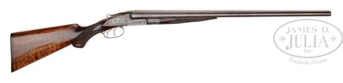 Additional Information: There is a slight hairline crack below right lock plate. *EXCEPTIONAL HIGH CONDITION LEFEVER 20 GAUGE FE GRADE GAME GUN. SN 38154. Cal. 20 ga. 2-3/4″ Chambers. 26″ Striking chain Damascus bbls fitted with raised, flat, matted rib, are stamped with SN and “E” on bottom of left bbl. Case hardened small frame typical late Lefever ejector action is stamped with “XX” small frame mark, SN, and “F” on water table. Action is engraved in typical “F” style with small flourishes of scroll on bottom of action and sideplates, which are also engraved with game birds; a quail on left, and a duck on right. Trigger plate is stamped with patent dates, the last being “87”. SN is at grip of case hardened and scroll engraved trigger guard. Triggers and cocking indicators are nickel-plated. Nicely streaked and lightly figured European walnut capped pistol grip buttstock measures 13-7/8″ over checkered composition buttplate with Lefever logo. Stock features point pattern checkering with beaded border and nicely fluted comb. Matching splinter forend has steel tip and central medallion. Bore diameter: left -.625, right -.623. Bore restrictions: left -.005, right -.000. Wall thickness: left -.030, right -.023. Drop at heel: 3″, drop at comb: 1-3/4″. Weight: 6 lbs. 6 oz, LOP 13-7/8″. CONDITION: Excellent. Bbls retain 95% bold original brown with excellent definition to pattern, with a number of minor marks and a small area of speckling. Action retains 80 – 90% orig case hardening color, thinning and silvering at normal carry point at bottom front. Lockplates retain essentially all of their vivid case hardening color. Thumbpiece is silvered, as are safety, and rear of top tang. Steel medallion on forend still retains 70 – 80% of its color. Trigger guard is silvered at edges, and considerably at grip. Stocks retain most of what appears to be their orig varnish finish with some oil rubbed in. There appears to be a very small repaired crack at right rear just to the right of top tang. Bores are excellent, bright and shiny. Action is tight. Ejectors are in time. A rare American lightweight upland gun in an incredible state of preservation. 4-46354 MGM47 (5,000-8,000)