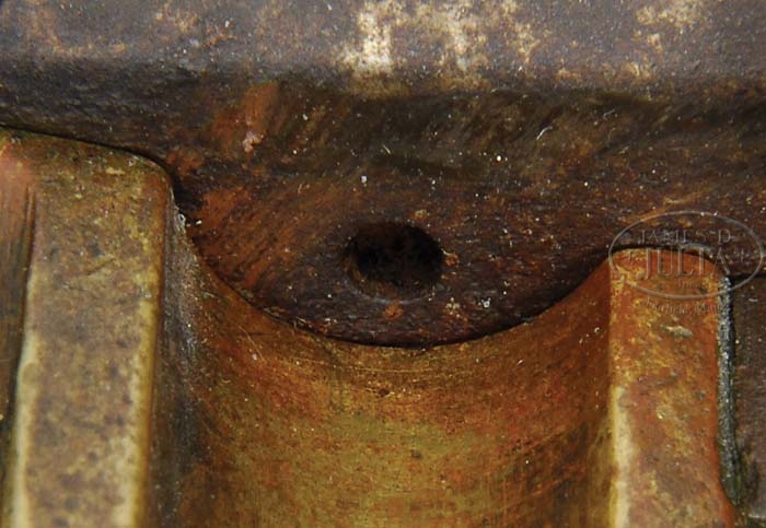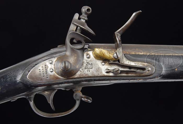 MODEL 1822/28 HARPERS FERRY MUSKET DATED 1836. Cal. 69. 42-1/16″ bbl marked with “V”/”P”/eagle head at left rear breech. Bbl tang is dated “1836” and has rack no. “Q/28″ near breech. Lock marked with a spread-winged eagle facing cock/”US” with “HARPERS/FERRY/1836” reading vertically in three lines behind the cock. Brass pan marked with “J/2”, battery spring marked with “R”, battery marked “M/2”, cock is marked with a “V” on its face, lockplate marked inside with “IV” and “S”, bridle is marked “H” and tumbler is marked “2”. Inside lock mortise is marked with “M”. Accompanying this gun is an orig bayonet marked on the 16″ blade “US/EB/L” in three lines (Erasmus Beal). Socket has a “T” and an engraved “8” in front of the mortise. Black walnut stock appears uncleaned and orig in all aspects showing inspectors’ marks of “AR/V” (Adam Rhulman) and “V/J.A.S.” (John A. Schaeffer). Overall this is a very difficult gun to locate in orig flint, most having been altered to percussion in the 1850’s. PROVENANCE: Peter Wainwright Collection. CONDITION: Originally bright metal, but now covered with layer of hardened grease turning to plum-brown patina. Lockplate face still in “as polished” condition still having regions of staining but no pitting. Wood is untouched and shows numerous dings and scrapes in various places not affecting soundness. A 3-3/4″ stress crack appears above the sideplate. 4-38208 PAS15 (3,000-5,000)