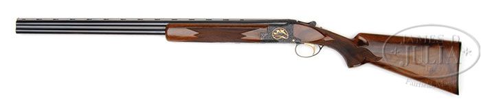 *SUPERB 28 GAUGE BROWNING SUPERPOSED MIDAS GRADE WITH CASE. SN 130F73. Cal. 28 ga. 2-3/4″ Chambers. 26-3/8″ Ventilated rib bbls are choked IC and Mod. Black finished action is engraved with nicely cut large shaded open scroll and acanthus as background for gold wire framed vignettes featuring semi-relief gold inlaid game birds; a trio of pheasants flying over meadow is on left; trio of ducks over marsh on right; and a bobwhite flying across open ground on bottom. Two different engravers signatures are found on lower rear of action; “A. Brigant” on left, and “R. Bee” (Rosa) is on right. Nicely figured and somewhat marbled Claro walnut long tang, square knob buttstock features typical Midas checkering and composition Browning buttplate. Stock and standard forend with point pattern checkering, have gloss varnish finish. Bore diameter: top -.543, bottom -.545. Bore restrictions: top -.007, bottom -.005. Drop at heel: 2-1/16″, drop at comb: 1-5/16″. Weight: 6 lbs. 12 oz, LOP 14-1/2″. Typical tan Browning case with metal tag on top, is lined with faux fur, and contains instruction booklet and key. PROVENANCE: Factory letter and copy of invoice, with specifications of this gun. CONDITION: Excellent, appears unfired, with only the faintest marks on wood and metal. Case is also nearly as new, with a few minor marks on exterior, and some slight soiling and compressions inside. 4-46716 MGM145 (22,500-27,500)