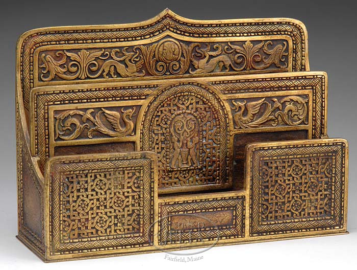 TIFFANY STUDIOS ENAMELED SPANISH DESK SET. Seven piece desk set includes two tier paper rack, inkwell, notepad, cedar lined cigarette box and blotter ends. Entire set has a wonderful gold dore, time darkened finish with enamel accents. This pattern is considered by many collectors to be the best of all Tiffany desk set patterns and pieces are even shown on the cover of the book “Tiffany Desk Treasures” by Kemeny & Miller. The central design of the Spanish pattern depicts medieval decoration with animals that blend into decorative accents, tails of fish-like creatures become frames at the top of the memo pad cover, tails of winged dragons blend into leafy foliage and turn into fish, dragons have wings instead of four legs and even the fish seem to have feathers. All of these creatures have opened mouths with tongues. Some pieces have repetitive patterns of urns while others have two nude children centrally located facing each other. The paper rack has arabesques in reference to Spain’s Moorish conquerors. The inkwell has unbelievable carved winged creatures in high relief. It is believed that the Spanish pattern is one of the last four designs created by Tiffany. All pieces are signed “Tiffany Studios New York” and are numbered. SIZE: Paper rack is 10″ x 7″. Blotter ends are 19″ l. CONDITION: Very good to excellent. 5-69019 (20,000-25,000)