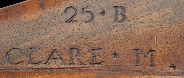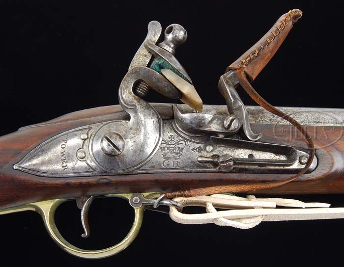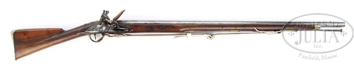 BRITISH 1795 INDIA PATTERN MUSKET. SN NSN. Cal. 77. 39-1/4″ bbl marked at the breech crown/”GR”/broad arrow over crown/crossed scepters. Bayonet lug set back 2-3/16″ from muzzle. Lock marked crown/”GR” with crown/broad arrow under the pan, marked “TOWER” in a vertical arc behind the cock. Stock marked with storekeeper’s mark consisting of a script “GR”/”1800″. Behind trigger guard is a crown/”7″ above crown/”1″ with “IP” stamped mid-way between trigger guard and buttplate. In the wood opposite the lock are the initials “IR”. Branded into the butt on the left rail is “25 + “B” over “CLARE” + “M”. This is a fine example of a British infantry musket issued to militia forces during the Napoleonic and War of 1812 period. PROVENANCE: Ted Knee Collection. CONDITION: Condition of metal is excellent showing no evidence of pitting but some light surface rust that wipes off easily and can be removed without affecting the condition of the metal. Brass furniture is in equally nice condition. Wood stock having only a 2″ x 3/4″ pc of replaced wood, probably done at the time of manufacture. Gun is complete with its orig ramrod, having a reproduction sling and modern leather battery protector. 4-36519 PAS10 (5,000-8,000)
