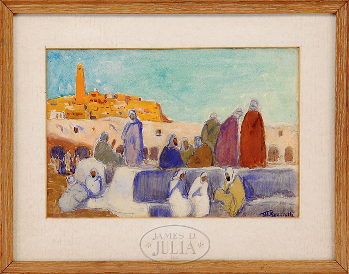 MAURICE BOIUVIOLLE (French, 1893-1971) MID-EASTERN TOWN WITH FIGURES. Watercolor scene shows men and woman on a two-tier platform overlooking buildings and hill with tall spiral. Signed lower right. Housed in a simple oak frame with white matte. SIZE: Sight: 7″ x 10″. CONDITION: Very good. 9-97586 (400-500)