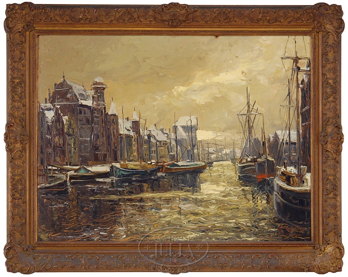 ERICH MERCKER (German, 1891-1973) DUTCH HARBOR. Oil on board harbor scene shows a waterway through buildings lined with docks and moored boats. All under a tan and yellow sky. Signed bottom right “E Merker”. Housed in a gesso decorated gilt frame. SIZE: 26-1/2″ x 35″. CONDITION: Chip to board at top edge, otherwise very good. 9-97353 (500-800)