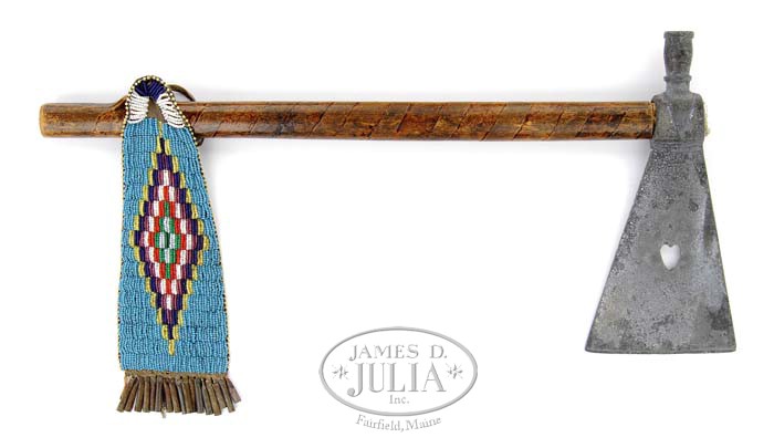 PEWTER PIPE TOMAHAWK. Late 19th century. Large triangular pewter blade, pierced with a heart cut-out design is attached to a hardwood haft decorated in a burnt-spiral design. Large buckskin panel decorated in geometric design with various colours of seed beads and a in cone fringe is tied to the handle. SIZE: Haft is 18″ l; head is 9″; beaded tab is 9″. CONDITION: Haft is broken at top, overall good. 4-35084 JK10 (6,000-8,000)