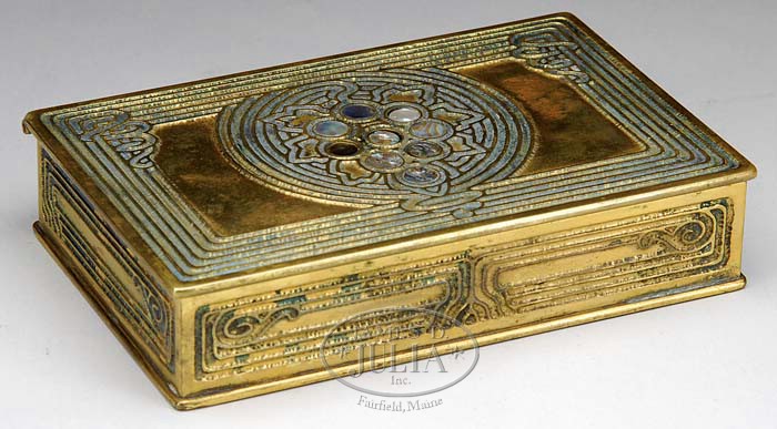 TIFFANY STUDIOS ABALONE UTILITY BOX. Very nice Tiffany Studios utility box has center medallion with grape leaf design and abalone discs inlaid to depict a cluster of grapes. The edge of the box is decorated with impressed parallel bands. Bands have remnants of green coloring. Impressed on the underside “Tiffany Studios New York 1176”. SIZE: 5-3/8″ x 3-1/2″ CONDITION: Very good to excellent with some minor wear and discoloration to patina. 5-68586 (800-1,200)