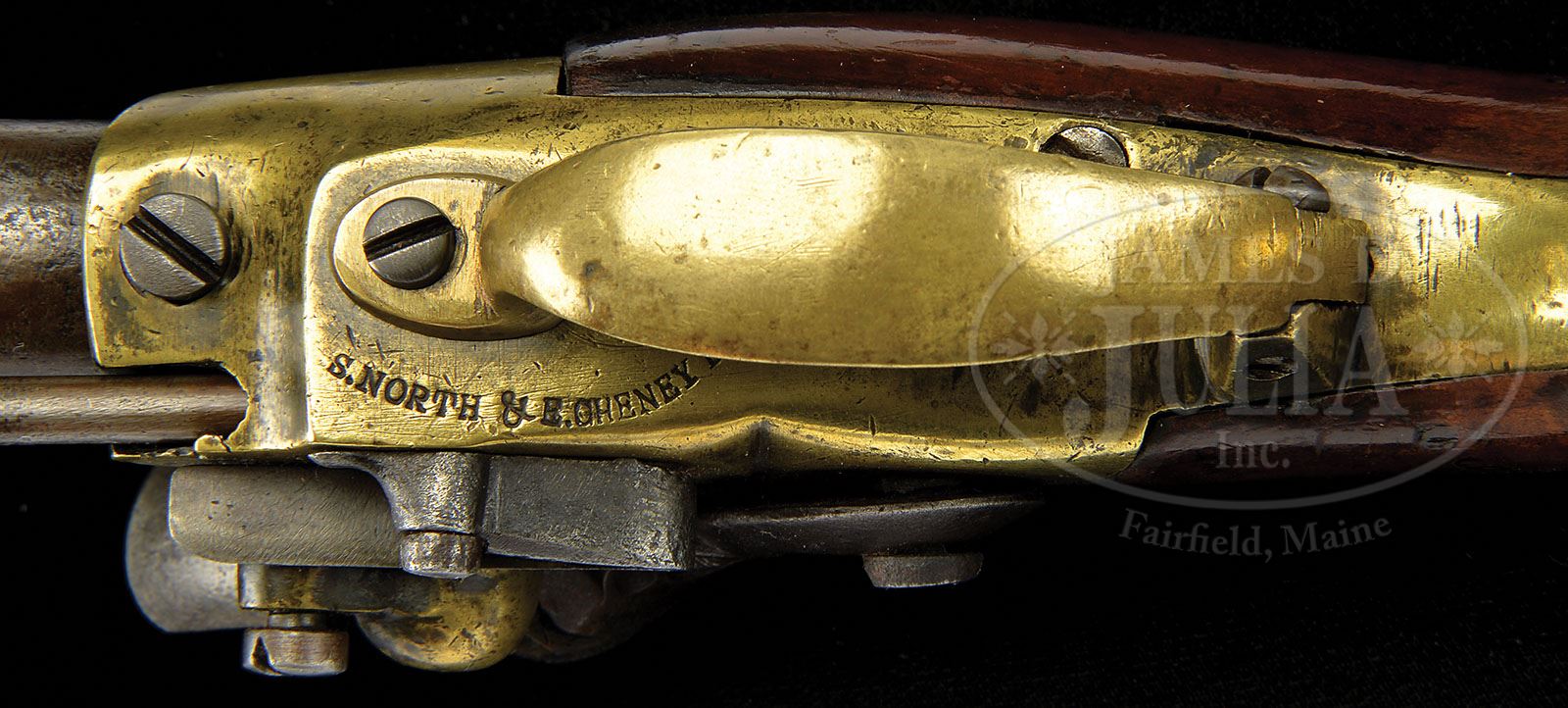 MODEL 1799 NORTH & CHENEY FIRST MODEL FLINTLOCK PISTOL. SN 354. SN 354. Cal. 73. x 8-1/16″ unmarked rnd bbl numbered on right side of tang “35” (4 not clearly visible) in back of tang marked “IV”. Underneath bbl is “354” and “..” which matches the same “..” on the left side of bbl tang. Brass frame is marked underneath “S. NORTH & E. CHENEY BERLIN”. Serial number “354” marked inside frame. Like the frame, the butt cap is made of brass. “IV” is present on the backstrap, bridle, tumbler, buttcap, trigger guard and main spring. Cherry stock is unmarked. Here is the opportunity to own the Rosetta Stone of United States martial pistols. Simeon North and Elisha Cheney signed a contract with the Government to manufacture 500 pistols on March 8, 1799 and were the first pistols manufactured entirely by a contractor, as all previous procurements were assembled from parts either in storage or made by various people. These new pistols were derived from the French Model 1777 Pistol with several improvements incorporated such as approximately 1/2″ longer bbl and an additional screw securing the frame to the bbl. These first 500 were marked “S.NORTH & E. CHENEY BERLIN” along the brass frame while the second contract were marked “NORTH & CHENEY BERLIN”. With these first 500 pistols delivered by early 1800, a second contract was forthcoming to Simeon North and Elisha Cheney for 1,500 pistols dated February 6, 1800. The final delivery of the 1,500 pistols were delivered by mid-year 1801 and effectively launched Simeon North into his pistol making venture that lasted another 25 years. PROVENANCE: See Auction Catalog of 1984. Collection of Dr. Douglas Sirkin. CONDITION: Iron bbl and tang are in very good condition with only slight evidence of pitting as bbl appears to have been cleaned at one time with remnants of the “V” (view mark) partially visible and now shows a light color. Area around touch hole has an overall light brown patina. Frizzen fits loosely, may be replaced as it and the cock do not carry assembly numbers, but if replaced it was very well done and matches the correct pattern and color. Brass frame and butt cap are in very good condition with all markings sharp and clear. Has not been cleaned and shows numerous nicks, dings and scratches from normal handling. Cherry stock is correct having no cracks or wood losses. Pistol is original flint. Considering that less than two dozen of these rare and historic martial pistols are known to exist of the 2,000 orig delivered, this gun being a first model (about 6 are known) would make this an important addition to any advanced martial pistol collection. 4-49982 PAS59 (25,000-45,000)