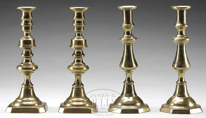TWO PAIR OF BRASS CANDLESTICKS. 19th- century. The first pair with square bases and canted corners. The second on octagonal bases. SIZE: 9-3/4″h and 10″ respectively. CONDITION: Ejectors present in all candlesticks. Very good overall. 9-20084 (200-300)