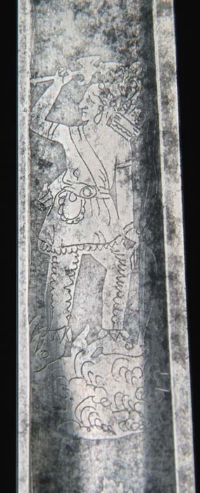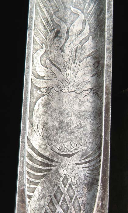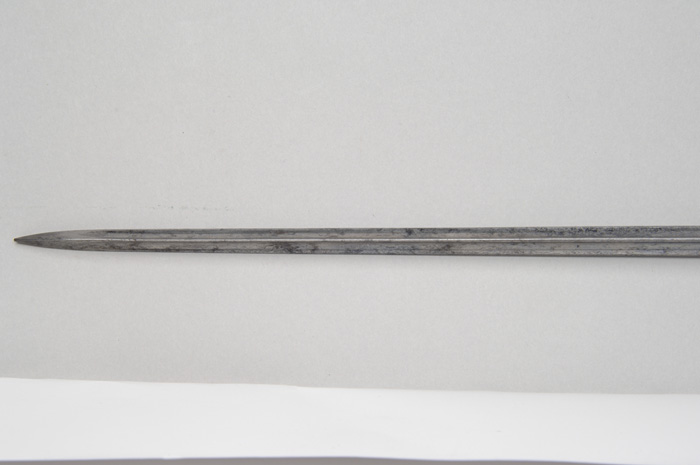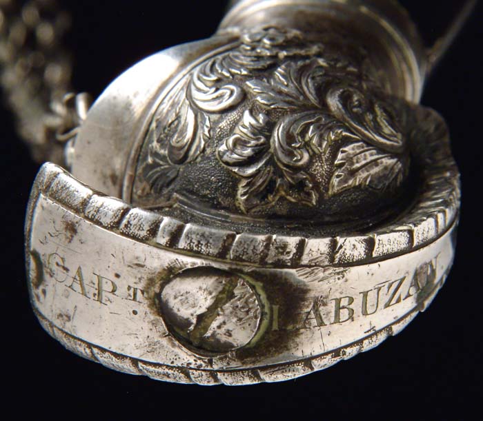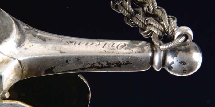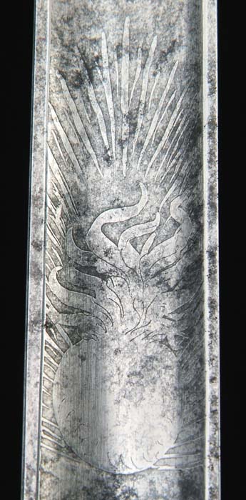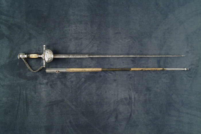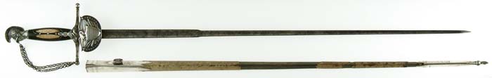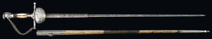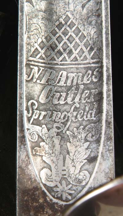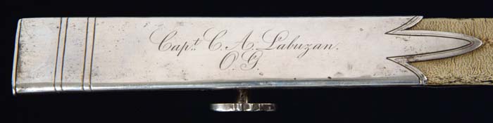OUTSTANDING HIGH-GRADE AMES PRESENTATION SWORD OF LOUISIANA GENERAL CHARLES LABUZAN. Sword is of the highest quality made by the preeminent American sword maker of its time, N. P. Ames, of Springfield, Massachusetts. Hilt and mounts are sterling or coin silver. American swords made of precious metal are rare and desirable and generally reserved for state and congressional presentations. Grip is ebony wood with inset silver and mother-of-pearl. The use of inset ebony is rare in Ames swords; one well-known example is the Kentucky Giant’s sword of James Porter pictured in Hamilton’s Ames book. The sword exhibits numerous unique features of the highest quality and design. This was a custom designed sword and there is nothing else like it ever made. This is indeed the only Ames sword known with a true colichemarde blade. Colichemarde blades originated in 18th century France, and were thought to be the best blades of their day. (See Peterson, American Swords). Cruciform guard is decorated with seashells terminating upward into a flaming bomb. The top of the guard is engraved “Orleans Grenadiers”. Presentation languet shield is surrounded by flags, weapons, and stars with a large spread wing eagle above the shield which reads “Presented to Captain C. A. Labuzan by the members of the Orleans Grenadiers, January 24, 1841”. The pommel is Knights head with highly detailed foliate decoration. Top of pommel is engraved “Capt. Labuzan”. Blade is colichemarde and finely engraved. Triangular colichemarde blades are rare in American swords and since they originated in France and New Orleans had so much French influence; the Orleans Grenadiers must have specifically asked for this French inspired blade. Blade is decorated with flaming bombs, patriotic shields, sprays of arms, and Indian with Tomahawk raised, eagle surmounted with stars and “liberty”, and an eagle holding a ribbon, which reads “Grenadiers d’Orleans”. Scabbard is form-fitted, brass-covered with leather, which is flaking and partially missing. This leather can be restored easily and aesthetically. The long silver drag is finely engraved with foliate decoration terminating in a “flaming bomb.” Throat is finely engraved with a frog button decorated with two flags and a liberty cap. Throat is also engraved “Capt. C. A. Labuzan, O.G.”. General Charles Labuzan’s obituary appears in the first column of the front page of the New Orleans Picayune on June 30, 1869: “Gen’l Labuzan reached quite a ripe age during the whole of his life . . . he served in the Mexican war . . . began prominently connected with the volunteer military companies of the city and was captain of that favorite one, the Continental Guards, and in the organization of state troops in 1861, became Brigadier General under Governor Moore.” On the front page of the New Orleans Picayune (Jan 26, 1841) the story of the presentation of the sword appears . . . “Urbain Plauche, a veteran of 14-15, one of the remaining heroes of our glorious eighth of January, and the oldest of the Grenadiers was selected to present the sword”. Labuzan in his acceptance speech “ . . . so long as I am associated with the Orleans Grenadiers in any capacity whatsoever, it shall be my highest pride, as well as my cherished delight, to make any improvement in their ranks, to enhance their reputation as men, and their glory as soldiers.” The paper further states “the sword is of exquisite workmanship, “very dear to fancy, very responsive to the hilt, of more delicate carriage and very liberal conceit” it was made in Springfield, Mass by N. P. Ames, and he is every way worthy to be looked upon with pride as a specimen of native manufacturer. The blade is “of the ice-brook’s temper”. The hilt is of inlaid ebony, held in chased and engraved ornamental work of solid silver . . . a more tasty and elegant affair would hardly be conceived. We venture to say no enemy of America will ever wish to die by more beautiful weapon, or by a braver hand than the one in which it has been placed.” CONDITION: Blade is gray/bright with scattered black staining, however, etched panels are all distinct and discernable. About a two-inch piece of silver wire is missing from obverse sword handle. Silver mounts and hilt exhibit black oxidation in recessed areas. High areas appear polished. Brass scabbard body is missing about 50% of its orig white leather covering. 8-76159 JS12 (75,000-85,000)