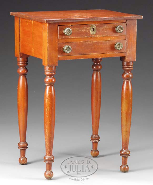 MAINE SHERATON BIRCH AND MAPLE TWO-DRAWER STAND. Second quarter 19th century. The rectangular top above the conforming case fitted with a pair of drawers, raised on swelled cylindrical ball-turned legs. SIZE: 30″ h. x 19-3/4″ w. x 17-1/2″ d. CONDITION: Retains original surfaces in red wash and original brass knobs. Right rear corner facing of top with a 5″ x 1″ old repaired split. Top also with old shrinkage crack at midpoint and some old staining. Otherwise very nice original condition. 9-94471 (500-800)