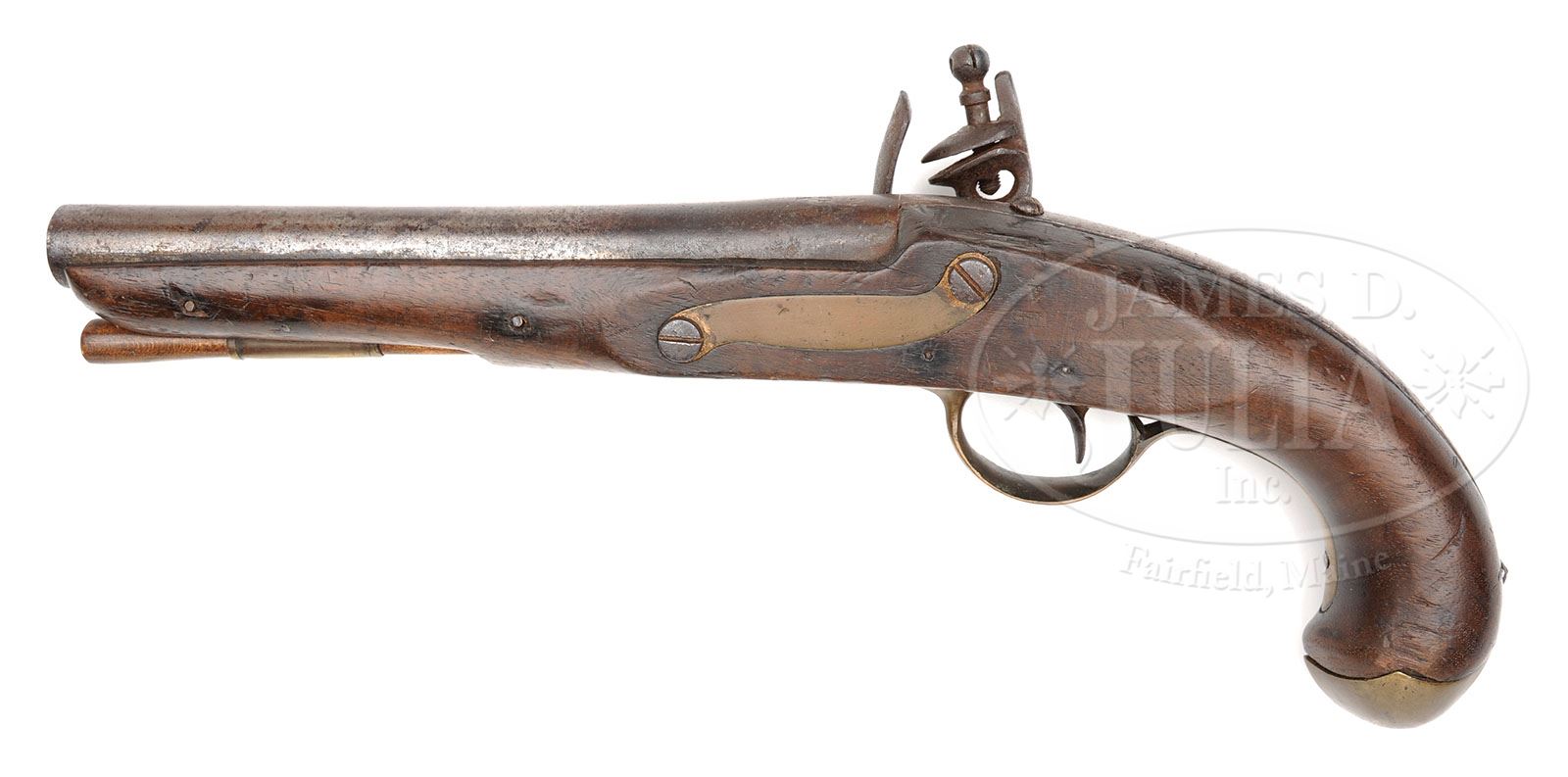 1811 S. NORTH PINNED FASTENED CONTRACT PISTOL. SN NSN. .73 Cal. x 8-3/4″ long bbl marked at top near breech “P/U” (“S” missing), “P” on back strap and has been reconverted back to flintlock. 5-3/16″ long lock marked under brass pin spread winged eagle facing muzzle over “U.STATES” and reading in three vertical lines behind the cock “S.NORTH/BERLIN/CON”. Brass furniture consists of rammer pipe, trigger guard, buttcap and side plate. American black walnut stock marked “V/HHP” (Henry H. Perkins) in wood opposite lock. This is one of 606 pistols delivered by North under his contract for 2,000 pistols. PROVENANCE: See Guide to American Antique Firearms and Their Values, 1998, by Flayderman. Collection of Dr. Douglas Sirkin. CONDITION: Bbl is in very good condition showing only minor darkening near breech and touch hole. Backstrap shows medium pitting but has not been cleaned. Lock is in good condition showing minor pitting, all markings visible, having been reconverted using some old parts and could be made to look much better. Brass furniture shows a nice aged patina and is in very good condition. Stock is in very good condition with no cracks, chips and only one small gouge behind left bbl tang measuring 3/4″ x 1/8″ not affection overall appearance of gun. 4-49807 PAS60 (9,000-12,000)