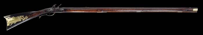 EXCEPTIONAL RELIEF CARVED GOLDEN AGE PETER BERRY KENTUCKY RIFLE. .54 cal smooth bore. This fine relief-carved Kentucky rifle, with its 43-5/8” long full oct bbl and signed “P. Berry” in script on the top bbl flat, and exhibits all the classic characteristics used by this highly-regarded Pennsylvania gunsmith. Peter Berry rarely changed his style, using the same brass fittings such as his buttplate, triggerguard, and signature sideplate throughout his career. Also, his relief-carvings and incised details only varied slightly so that even unsigned specimens are quite attributable. He used very robust C-scroll patterns around the high cheekpieces and bbl tangs and also used very fine buttstock and forestock moldings. In particular, his typical broad teardrop lobes around the flintlock and sideplate panels are easily recognizable. His brass patchboxes, especially, are seen as another one of his signature hallmarks because they always exhibit multiple piercings and a 4-petaled flower as the finial, and have an overall gracefulness. Along with the domed patchbox lid, Peter Berry used a rectangular iron release button on his toeplate to open the lid. Most gunsmiths preferred the rnd iron button and very infrequently used this detail. Architecturally this rifle follows his classic profile of a long slender wrist leading into a graceful “Roman-nose” buttstock, all of which contributes to the rifle’s overall long, slender appearance. Peter Berry worked in the small town of Annville, west of Lebanon and is listed in the Dauphin County, PA tax records as a gunsmith. It was once thought that he died in 1796, but subsequent research indicates that he worked into the first quarter of the 19th C. Throughout his career, his rifles only varied in occasional details, but he was very consistent in his style. The late highly esteemed Joe Kindig, Jr., in his landmark publication “Thoughts on the Kentucky Rifle in its Golden Age” (published 1960), stated, “Peter Berry was an exceptionally fine maker of long slender guns with beautiful patchboxes and unusually fine carving. He should be considered a grand gunsmith.” CONDITION: Both the “hand-forged” flintlock and the full oct bbl show every appearance of being orig flint and an orig steel bushing in the bbl’s touchhole is evident. Some minor wood conservation was performed by David Wagner, now deceased, a Colonial Williamsburg gunsmith who replaced the missing brass nose-cap and 3-3/8” of wood on the upper right hand side of the forend and also a 9-1/2” of wood on the upper left hand side. Both these repairs are visible only on close inspection. At one time during the rifle’s period of usage, a brass plate had been applied over the front of the trigger guard and around the front of the lock and sideplate that was held with very small screws, securing an old break at the lock-trigger guard area. This plate has been removed, the break secured, and tiny pieces of wood neatly inlaid into the screw holes. All of this work is only visible upon close inspection, as is a small sliver above the front of the flintlock. Overall, the entire stock retains its integrity, with only the above noted exceptions. This conservation enhances the appearance of this long, slender, graceful rifle. The overall condition of this Kentucky rifle, along with its warm rich color, graceful architecture, and eye-pleasing decorations, make this Peter Berry rifle a classic and desirable example of this renowned gunsmith’s workmanship. 4-39759 RG18 (30,000-45,000)