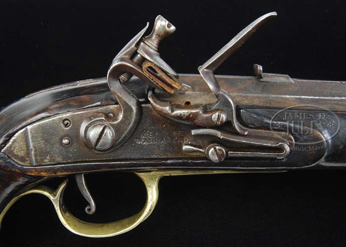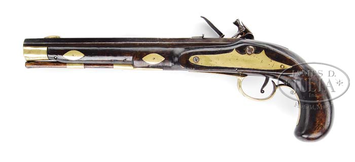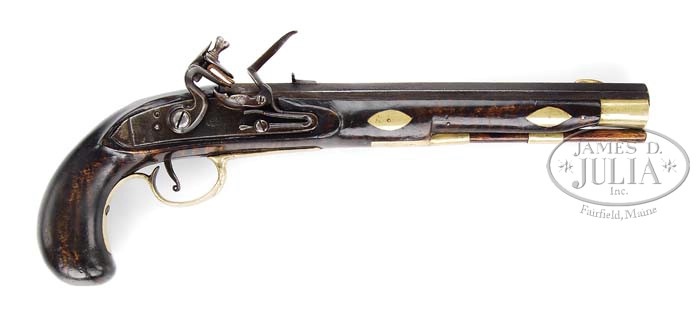 UNMARKED FLINTLOCK KENTUCKY PISTOL WITH ASHMORE LOCK. Cal. .43, 9-3/4″ oct bbl, rifle with 6 very shallow grooves at the muzzle. Bbl is unmarked. Lock marked under pan “ASHMORE/WARRANTED” and is in good working order. Maple stock is 14″ long and mounted with a brass nose cap, two simple ramrod pipes, a simple trigger guard and triangular side pipe and four escutcheons are inlaid around the bbl pins. Behind the bbl tang is a 1/2″ x 3/4″ escutcheon that is unmarked. The bbl is mounted with a brass front sight 7/8″ from the muzzle and a dove-tailed rear sight is mounted 1-5/8″ in front of the breech. CONDITION: Condition of metal is very good, showing its age, but no excessive pitting. Lock is very solid and in good working order and all mountings fit tightly to the maple stock which is in very good condition for its age. 4-39514 PAS69 (4,000-6,000)