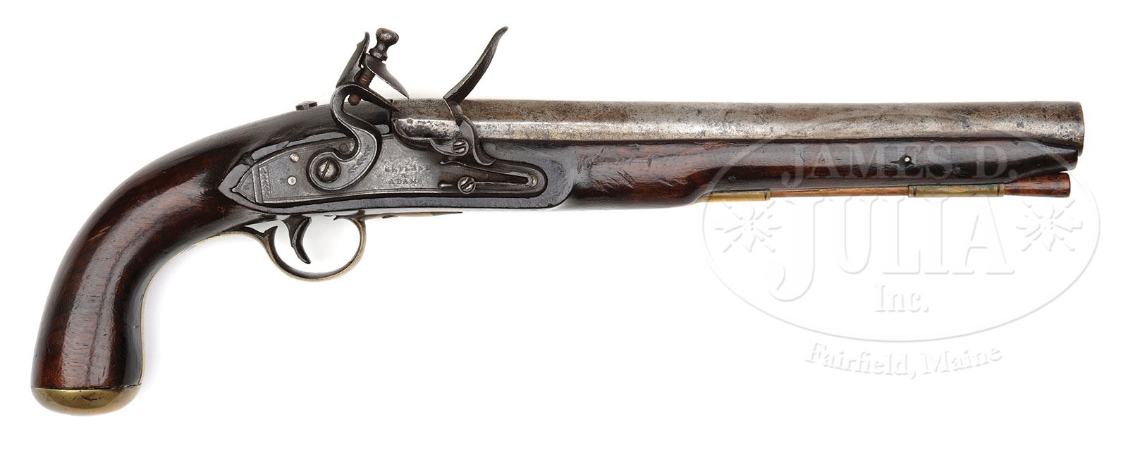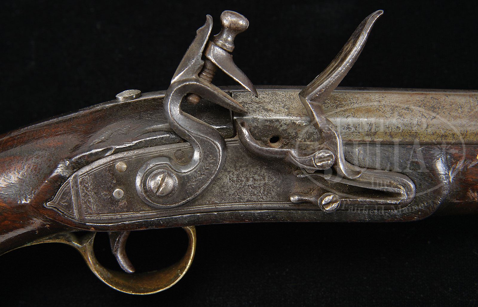 MASS MILITIA PISTOL. SN NSN. .71 Cal. x 10-1/8″ long bbl marked at left breech “PM/LH” indicating proofed in the Commonwealth of Massachusetts and inspected by Luke Harrington. 4-5/8″ long lock marked under the iron integral pan “KETLAND & ADAMS” (Circa 1818). Furniture consists of two brass rammer pipes, trigger guard, buttcap, circular washers opposite lock. Walnut stock is 15-3/4″ long and is unmarked and is accompanied by a 9-5/8″ ramrod that fits nicely in this gun and may be orig to the period. PROVENANCE: See Guide to American Antique Firearms and Their Values, 1998, by Flayderman, p. 293, 6B-019. Collection of Dr. Douglas Sirkin. CONDITION: Bbl is in very good condition with only light staining and light to moderate pitting around touch hole and associated lock area. Lock has an over all nice aged patina and is orig and complete. Brass furniture is in excellent condition with only a few minor scratches from handling. Walnut stock is in very good to plus condition with no cracks or splits and only a few minor handling marks. Overall a nice example of a Massachusetts militia pistol. 4-49922 PAS64 (2,500-4,500)