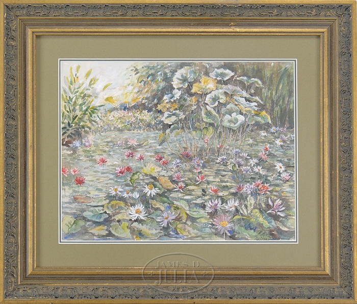 BEATRICE PARSONS (British, 1870-1955) NATURES PALLET. Outstanding watercolor shows a small lily pond covered with colorful flowers and wide lily pads. Signed bottom right. Housed in a fine modern gilt frame with double green mattes behind anti-glare glass. SIZE: Sight: 10″ x 13″. CONDITION: Very good. 9-95758 (800-1,200)