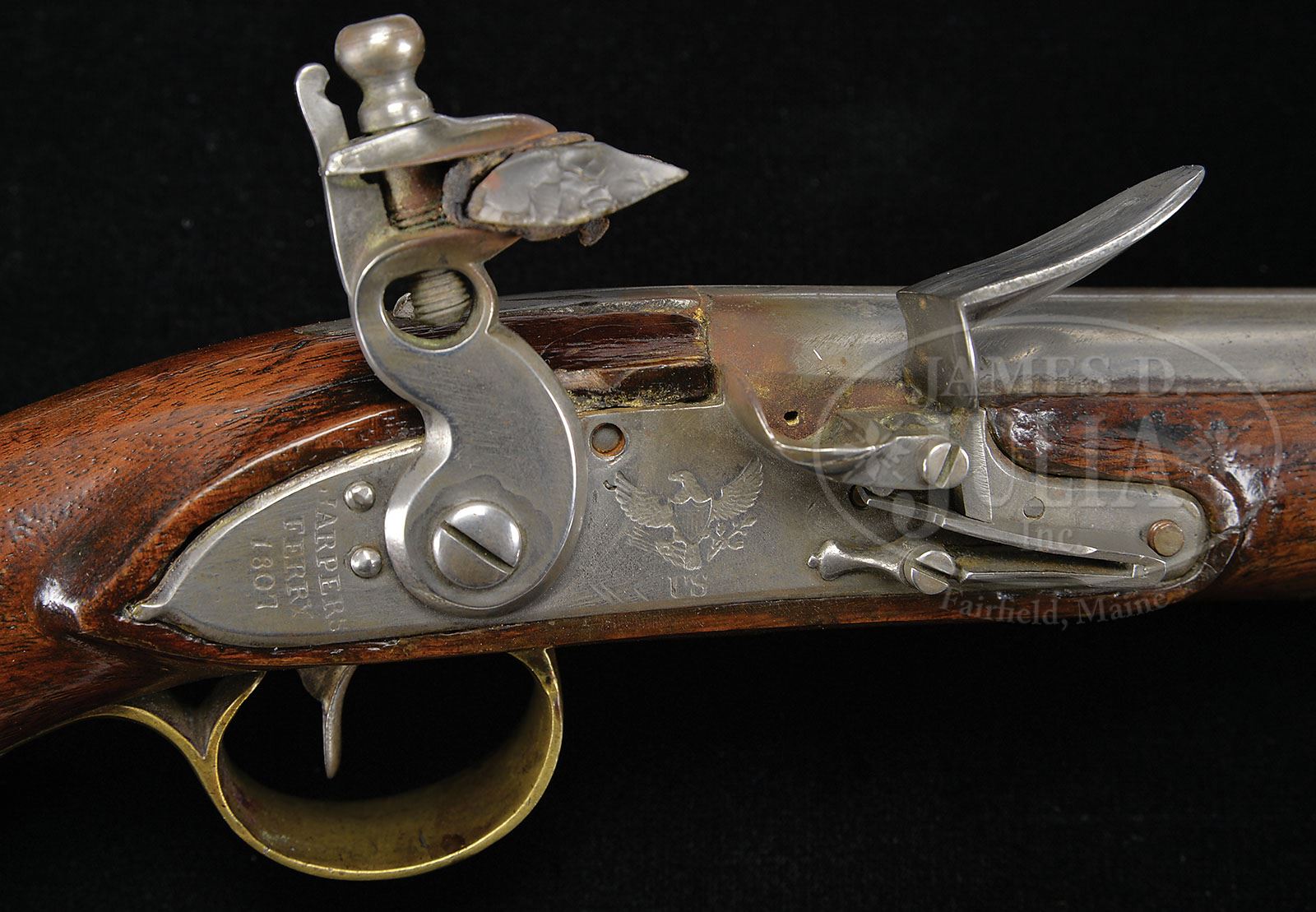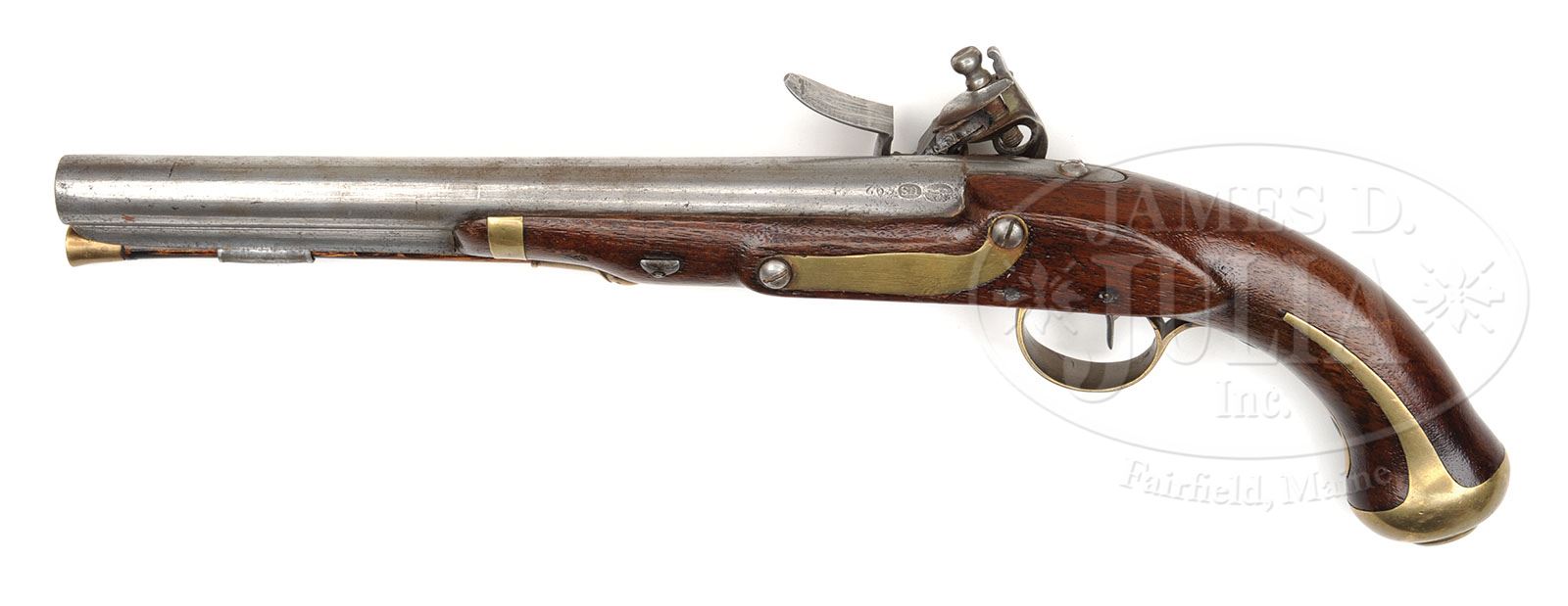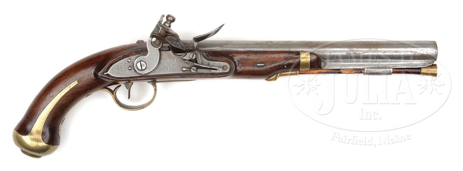 U.S. MODEL 1805 HARPERS FERRY PISTOL. SN 692. Cal. 54. 10″ rnd bbl, breech marked with raised eagle over “P” in a sunken oval behind a raised “US” in a sunken oval behind SN 692 (only top of 6 is visible). Lock is marked “HARPERS/FERRY/1807” in vertical arcs behind cock. Under the pan is a spread-winged eagle facing toward the cock over “US”. The lock is reconverted to flint. Harpers Ferry furniture consisting of rear rammer pipe, trigger guard, buttcap and side plate all of correct pattern. The wood opposite the lock is unmarked, having been varnished at one time and the inspector’s mark has been covered. Harper’s Ferry pistols are amongst the most sought after U.S. single shot martial pistols and this piece is a nice representative example. CONDITION: Metal is in overall very good condition with evidence of having been cleaned at one time. The bbl key appears to be orig and the ramrod, a nice replacement with a worm on the entry end. Brass work has a nice yellow color, wood overall is dark with no major wood losses, nicks or dings. 4-48324 PAS45 (4,000-6,000)
