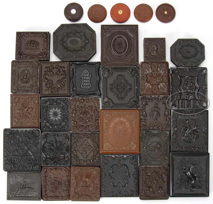THIRTY-NINE SMALL DAGUERREOTYPE CASES. Lot includes seventeen 1/6 plate cases including The “Fire Chief” (plate 12, Rinhart); :The Medallion of George Washington (plate 6, Rinhart); “Profile of a Patriarch” (plate 38, Rinhart); “The Eagle at Bay” (plate 70, Rinhart); “The Huntress and the Falcon” (plate 44, Rinhart). Each case with various types of images. Along with seventeen 1/8th / 1/9th plate cases of various designs. Along with one 1/16th plate and four small round cases. PROVENANCE: Rose Lulich Collection, Eagle River, WI. CONDITION: Generally very good with some small nicks. 9-97789-2 (500-1,000)