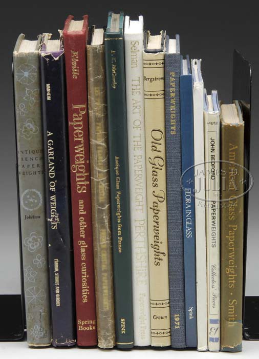 TWELVE PAPERWEIGHT REFERENCE BOOKS. Lot includes American Glass Paperweights by Francis Edgar Smith, Paperweights by John Bedford, Glass Paperweights: An Old Craft Revived by Paul Hollister, Flora in Glass: Paperweights by Paul J. Stankard, Glass Paperweights from the Estelle Doheny Collection at St. Johns Seminary, Old Glass Paperweights by Evangeline H. Bergstrom, The Art of the Paperweight: Perthshire by Lawrence H. Selman, Antique Glass Paperweights from France by Patricia K. McCawley, Les Presse-Papiers Francais de Cristal (hardbound in French), Paperweights & Other Glass Curiosities by E.M. Elville, A Garland of Weights by Frank J. Manheim and Antique French Paperweights by Paul Jokelson. PROVENANCE: Barry Schultheiss Collection. CONDITION: All very good with some minor wear and staining to some covers. 5-63722 (100-200)
