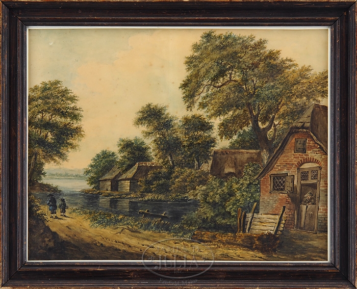 CORNELIS SPRINGER (NETHERLANDS, 1817 – 1891) WAITING AT THE TAVERN. Watercolor scene shows a man at the door of a brick tavern watching two passers by walk down a dirt path. The tavern is at the end of a small outlet with other buildings. Signed center bottom “C. SPRINGER”. Housed in a walnut molded wood frame with white liner. SIZE: Sight size: 15″ x 19-1/4″. CONDITION: Some light foxing. Good. 9-96785 (800-1,200)