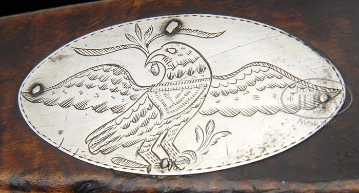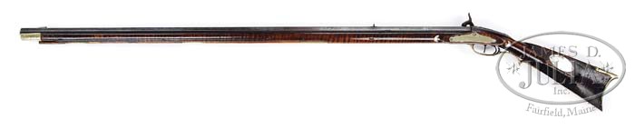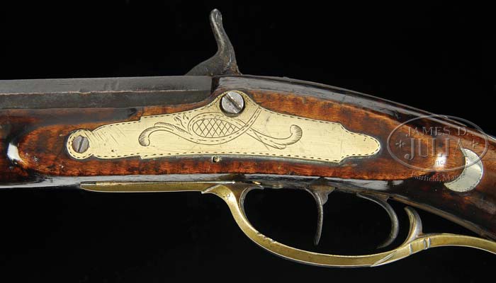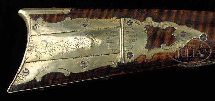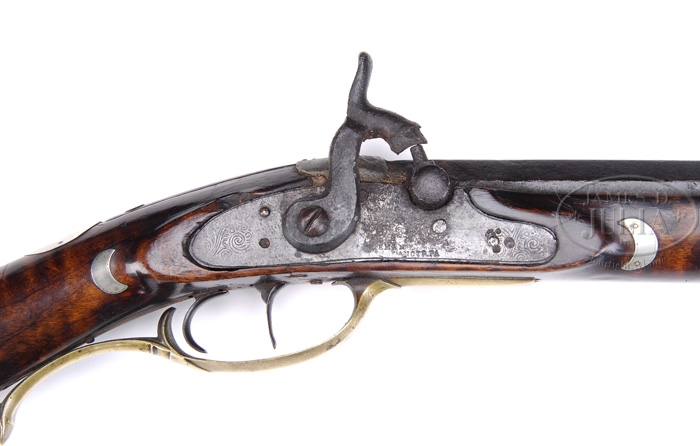 SIGNED PERCUSSION ANDREW KOPP HUNTINGDON SCHOOL RIFLE. This orig percussion rifle is signed in script “A. Kopp” on the top flat of its rifled 42″ full oct .45 cal rifled bbl. The stock of curly maple retains its orig rich, warm color and the brass patch box and side plate are nicely engraved. The patchbox is of the typical Kopp style with one piercing in the finial. There are six silver inlays, one of which is an oval cheek piece inlay featuring a finely engraved American eagle. The bbl still retains much of its “fire-blued” finish and the rifle has double set triggers. The orig percussion lock is stamped “Leman Lancaster”. Andrew Kopp was born in 1781 and died in 1890; Andrew retired from the gunsmith trade in 1862. Andrew’s son Geroge Kopp was also a well known gunsmith. Joe Kindig in his book Thoughts on the Kentucky Rifle in its Golden Age devotes two full pages to Andrew Kopp and pictures three of his earlier rifles. He notes that “he (Andrew) is entitled to some serious research as he was a real artist among Kentucky Rifle makers.” Kindig asserts Andrew learned his trade from George Eister (the superlative York County maker) with possible influence from Maryland’ John Armstrong. The earliest date of Andrew working as a gunsmith was in the tax records of 1809 in York County. In his book Gunsmiths of Pen-Mar-Va 1790-1840 William Bowers states Andrew may have spent some time working in Maryland prior to 1823. It is very unusual for examples of a father and his son’s rifles to each be offered for sale in one auction (Andrew and George Kopp). CONDITION: The bbl tang has been extended a bit during its period of use to strengthen the wrist area and there is some pewter infill between the lock and the barrel tang where wood had been burned away from the percussion ignition. The lock has heavy pitting. One silver inlay forward of the lock has been replaced and there is an early in period one inch repair to the toe of the butt plate. Overall the rifle is in very nice orig condition with no modern restoration. 4-39994 RG5 (2,500-4,500)