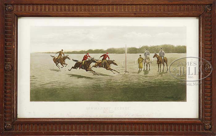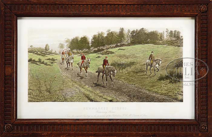AFTER JOHN ALEXANDER HARRISON BIRD (British, 1846-1936) NEW MARKET SCENES: “THE TRIAL” & “RETURNING HOME”. Two prints, one showing a horse race, the other shows horses and riders returning home. Both in landscapes. Each dated “1892”, after paintings by Harrington Bird and engraved by C R Stock. Housed in carved oak wood frames. Plate III and Plate IV. SIZE: Sight: 15-1/2″ x 27-3/4″. CONDITION: Some foxing and “The Trial” has water stain to the bottom margin. 9-98592 (400-600)