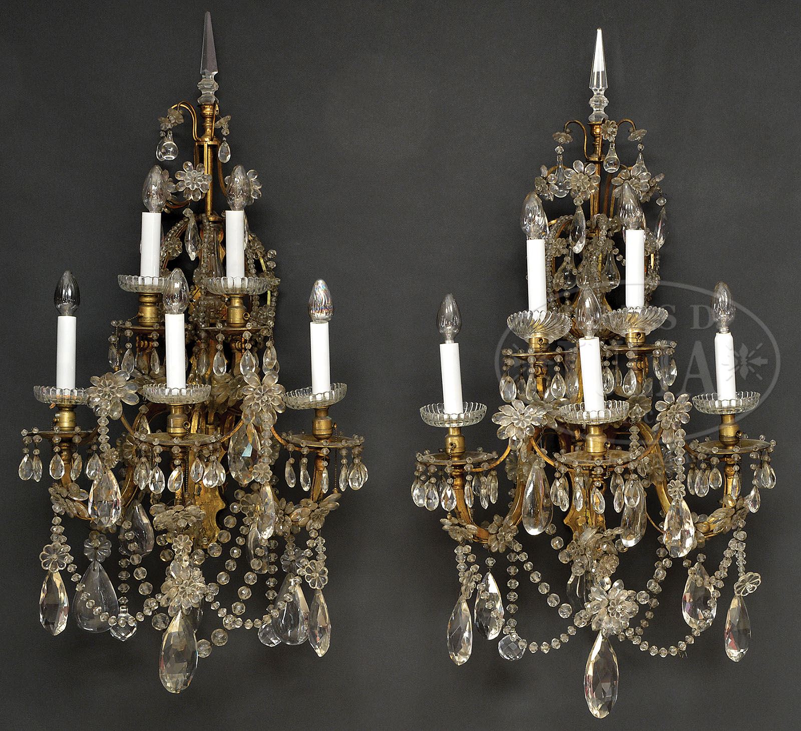 PAIR OF LOUIS XV STYLE ORMOLU AND CUT GLASS WALL SCONCES. Late 19th, early 20th century. Wired for electricity, each wall light with scalloped ormolu back plate supporting two tiers of candle arms, the uppermost with two lights, the second tier with three lights. Each arm with molded glass drip pan above a gilt metal drip pan hung with and connected by chains of faceted drops suspended from floral rosettes. The pattern repeated throughout each sconce. Each headed by a cut glass spearhead finial. SIZE: Approx overall: 34″ h x 18″ w. PROVENANCE: From a fine Maine and New York private collection. CONDITION: Brass surfaces original and untouched, prisms and chains for the most part intact, some of the smaller tear drop pendants are absent. Generally very good. 9-29911 (1,500-2,000)