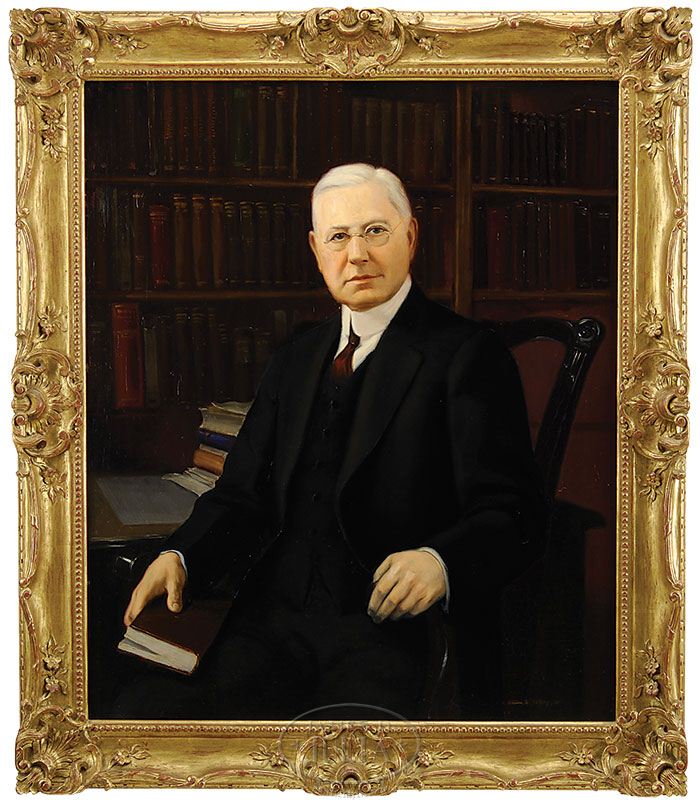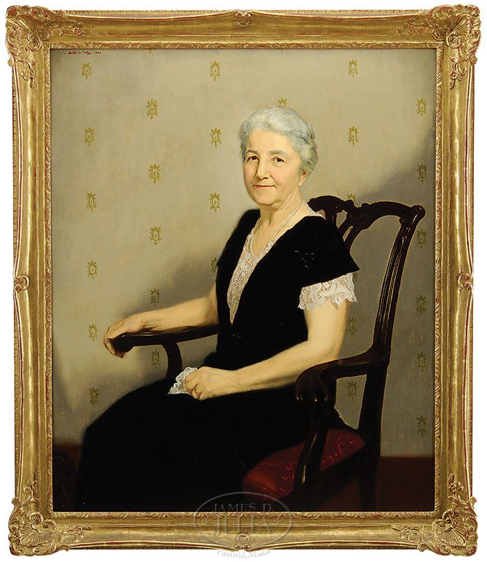 ALTON S. TOBEY (American 1914-2005) PORTRAITS OF JUDGE EDWARD D. CUTLER (1849-1931) AND LILLIAN M. CUTLER (1871-1967). 1) Oil on masonite portrait of a distinguished gentleman, 3/4 view, sitting in a Chippendale armchair. He sits in his law library with finger holding a page in a book held in his lap. He wears a black suit with brown tie and white shirt. Signed lower right. Dated “41”. Housed in an outstanding pierced decorated gilt frame marked “N.M. Co (Newcomb Macklin Company)”. 2) Oil on masonite, 3/4 view, portrait of a woman seated in a Chippendale armchair. She is seated against a printed wallpaper background. She wears a black dress with lace trim. She also wears a graduated pearl necklace and gold and diamond ring. Signed upper left and dated “1940”. Housed in a fine gilt gesso decorated frame, marked “N.M. Co (Newcomb Macklin Company)”. Judge Cutler was very active in Democratic politics in Schenectady, NY. He was an elected member of the States Assembly from 1884-1888 and was appointed County Judge in Schenectady by Governor Hill in 1889, later elected as Judge where he served until 1897. SIZE: 42″ x 35″. PROVENANCE: Consigned by Judge Cutler’s grandson. CONDITION: Both are very good. 7-70049 (800-1,200)
