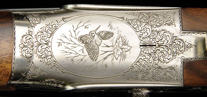 *BROWNING BSL LC2 BY LEBEAU – COURALLY SIDE BY SIDE GAME GUN WITH CASE. SN 918CS01064. Cal. 12 ga. 2-3/4″ Chambers. This custom shop, high quality, Belgian double with 28″ chopper lump bbls with narrow, concave game rib, are engraved “Browning Assembled by Lebeau – Courally” and “Mod. B. S. L. 12 ga 2-3/4″ Made in Belgium” on top. Coin finished sidelock action featuring non-automatic safety and double triggers, is engraved with about 50% coverage medium scroll with scenes of birds; flushing pheasant on left lock; duck over marsh on right; and swooping woodcock with alders in background on bottom. Scroll engraved trigger guard has SN on long tang. Nicely marbled and stump figured European walnut straight grip buttstock measures 15-1/4″ over checkered wood butt, and features standard point pattern checkering with double line border, drop points, and a vacant silver oval on toe line. Matching splinter ejector forend has Anson push button release. Bore diameter: left -.725, right -.723. Bore restrictions: left -.022, right -.009. Wall thickness: left -.032, right -.034. Drop at heel: 2-1/4″, drop at comb: 1-7/16″. Weight: 6 lbs. 15 oz, LOP 15-1/4″. Maroon vinyl makers case is lined with deep burgundy velvet with Browning custom shop label in lid, and contains Browning gun lock, bbl and action bags, and orig paperwork including certificate of identification and quality. CONDITION: Excellent, near new, having been shot very little. There are some minor marks on wood and metal, most notable are dime size scuff on bottom of left bbl about 8″ back from muzzle, and slight compression and marks in wood at toe. Mechanics are crisp. Case is excellent. 4-38239 MGM122 (12,500-17,500)