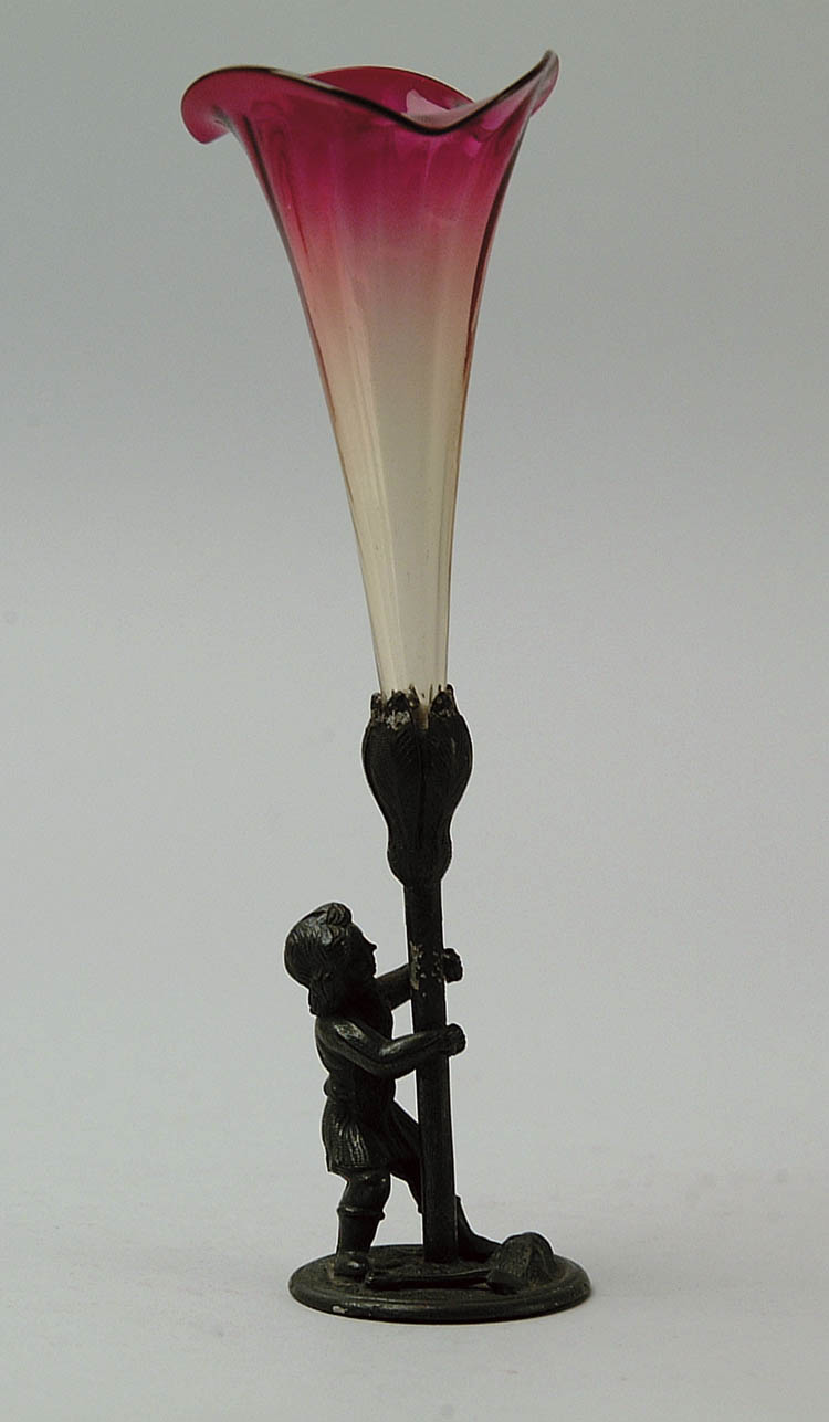 AMBERINA TRUMPET IN METAL HOLDER. Amberina trumpet with slight vertical ribbing mounted in a figural metal holder of a girl holding a flower. SIZE: 8 1/4″ tall. CONDITION: Very good to excellent. 5-67792 (600-900)