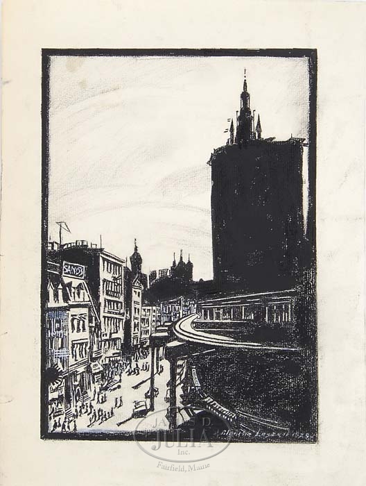 NETTIE BLANCHE LAZZELL (American, 1878-1956) “CHATHAM SQUARE, N.Y.C.” Mixed media white and black drawing shows a busy section of New York City with subway line, pedestrians and store fronts. Most done in a black charcoal/pencil, some white highlights. Signed lower right and dated “1929”. Also identified on reverse. Unframed. SIZE: Overall is 12″ x 9″. Image is 9-3/4″ x 6-3/4″. CONDITION: Some rubs, generally very good. 9-92101 (3,000-5,000)