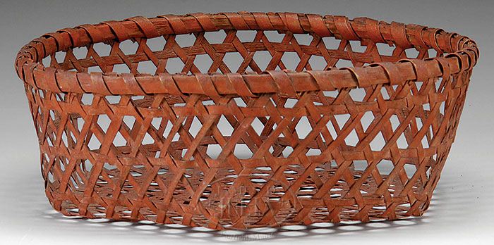 CHEESE BASKET IN SALMON PAINT. Circa 1850, New England. This small woven splint example retains original painted surfaces. SIZE: 4″ h x 11″ dia. CONDITION: Overall very good. One small, minor break to side. 9-25636 (600-800)
