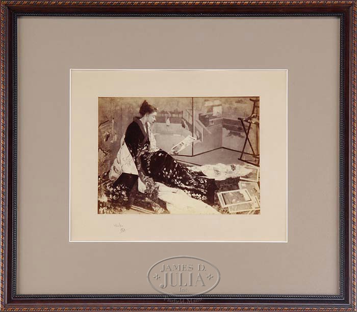 JAMES ABBOT MCNEILL WHISTLER (American, 1834-1903) WOMAN IN ORIENTAL MOTIF. Pencil signed photographic print of shows a woman draped in an Oriental material looking at woodblock prints with an Oriental screen behind her. Also the butterfly signature included. Housed in a nice modern wood decorative frame with brown matte. SIZE: Sight: 10-1/4″ x 13-1/2″. PROVENANCE: Private collection of Dr. & Mrs. Winfield Gibbs, Sunbury, PA. CONDITION: Very good. 9-92274 (500-800)