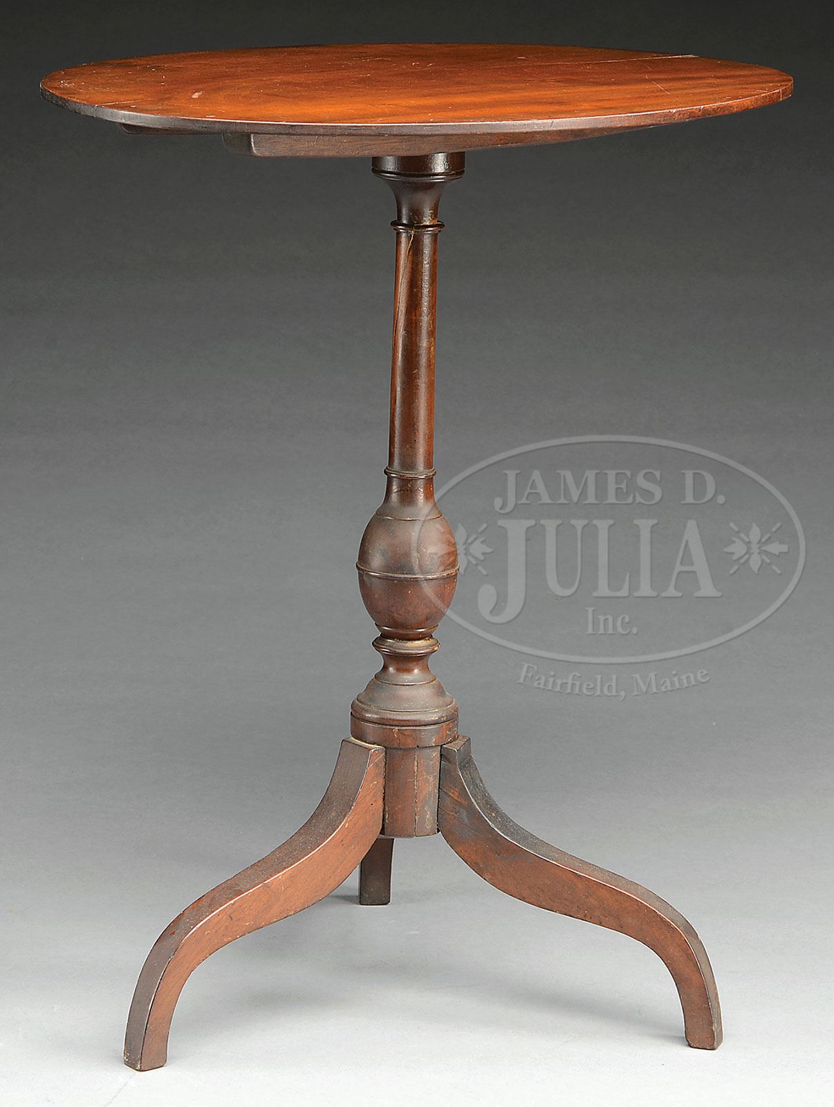 FEDERAL MAHOGANY TILT TOP CANDLE STAND. The oval chamfered top joined to a slender shaft with elongated egg-formed turning on a tripod spider-like base. SIZE: 28″ h. Top: 24″ l x 18-1/2″ w. CONDITION: Table retains old surfaces with old repairs to top of pedestal and to all legs and to base of pedestal. Old shrinkage crack at end of top, stabilized. 9-28835 (300-400)