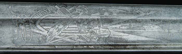 A TALE OF TWO BROTHERS: INCREDIBLE SWORD, SASH AND DIARY OF A NEW YORK OFFICER K.I.A. AND THE WARTIME EFFECTS OF HIS BROTHER SERVING IN AN ADJUNCT REGIMENT. A wonderful and historic archive and artifact compilation related to the Baldwin family of New York. The sword, sash and diary related to Lt. Col. Lathrop Baldwin. 107th NY Vol. Inf. who was killed in action at the Battle of Peach Tree Creek and military effects belonging to his brother Maj. Elisha G. Baldwin, Co. C, 141st NY Vol. Inf.. The lot consists of Lt. Col. Lathrop Baldwin’s presentation grade sword being a non-regulation Staff and Field Officer’s sword sold by Schuyler, Hartley and Graham with a 33” lightly curved blade that has bold and deep decorative etching featuring “U.S.” a spread winged eagle, scrollwork and other military and patriotic designs. Each side of the ricasso is marked “Clauberg, Solingen” and “Schuler, Hartley and Graham, New York”. The half-basket hilt is of cast brass with openwork scrolls, an eagle in flight carrying a long banner on the counterguard and a “US” superimposed on the knucklebow. The grip is of wood, covered in sharkskin and wound with braided brass wire. The bird’s head pommel and backstrap are one pc. The scabbard is of German silver with two ring mounts and an iron drag. Accompanying the sword is Lathrop’s red silk officer’s sash. Finally, and one of the most historic and interesting items in the lot is Lt. Col. Lathrop Baldwin’s diary for 1863. This diary, dated 1863, is a small leather covered book with gilt fore edges and is inscribed in the front “Capt. L. Baldwin, Capt. 107th Regt./NYSV/Wolf’s Shoals Onogman Creek/Va. Dec. 29th 1862/in command of the Regt”. The diary is filled with entries for the entire year INCLUDING nice entries for the Battle of Gettysburg. There is very nice content throughout. The remainder of the objects are related to Lathrop’s brother Maj. Elisha G. Baldwin, Co. C, 141st NY Vol. Inf. These items include an incredible hand painted and pen and ink escutcheon made in the form of a tablet or monument with an arched top supported by two fancy pillars on each side surmounted by a magnificent spread winged eagle, crossed American flags with the inscription “Service Record of Elisha G. Baldwin with the 141 N.Y.V.”. This is surrounded by different corps badges, a fort with cannon, troops and an ironclad. At the bottom is a salt print of Baldwin standing with a ¾ view in full uniform. The entire center is filled in with Baldwin’s service record, including all of the campaigns and battles he participated in. This colorful and wonderful hand done escutcheon is signed by the artist at the bottom and reads “Designed executed and presented by Corp. Charles Van Wagner to his old comrade Capt. and Maj. Elisha G. Baldwin December 5th 1897”. The escutcheon measures approximately 21” X 28” and is mounted in its orig oak frame. Elisha Baldwin’s vellum NY commission is also included-signed by NY Gov. Horatio Seymour. The framed document measures approx. 11.5” X 14”. In addition Baldwin’s cane with a gold handle is inscribed “Major E.G. Baldwin Christmas 1893 from Alice and John”. The cane is nearly 30” in length. Finally, the family scrapbook is included which is filled with numerous newspaper clipping, poems, short stories, a few photographs and obituaries of Civil War veterans including Elisha Baldwin’s. Additionally there are a few letters, a wartime document and a printed silk reunion ribbon for the 141st NY Vol Inf dated September 9, 1903. This lot is accompanied by numerous photostatic copies of archive records for both Lathrop and Elisha Baldwin. Lathrop Baldwin’s service is well documented with the hard fought 107th Ny. This regiment left Camp Rathbun in Elmira on August 13, 1862 and arrived in Washington on the 15th, marched through the city and over the Long Bridge into northern VA where for several weeks it camped and trained among the forts that guarded Washington. On September 6, it began its long hard march north to the battlefield of Antietam. It saw its first action, as a member of the 12th Army Corps’ First “Red Star” Division, north of Sharpsburg, MD in this battle that would be known as the single bloodiest day of the war. This division was commanded by Gen. A. S. Williams. The 12th Army Corps, and later when it became the 20th, had the reputation of never having lost a color or a gun. Following a winter of picket duty, guarding against other Confederate incursions along the Potomac River, it participated in the battle of Chancellorsville. Not long after Chancellorsville, it marched up to PA where it met another invasion of the North by Gen. Robert E. Lee at Gettysburg. The 107th was not involved in the repulsing of “Pickett’s Charge”, but it did help fight off the Confederate charge against Culp’s Hill earlier that day. Following Gettysburg the regiment was reassigned and sent to TN to guard railroads during the winter of 1863-64. Early in 1864 they were brought together in the 20th Army Corps, a consolidation of the 11th and the 12th corps which took place on April 4, 1864, and with other army corps by Gen. William T. Sherman to form an army of a 100,000, which would become one of the most famous armies in the history of warfare. The 107th fought hard in the many skirmishes and battles on its way to Atlanta, losing a great many men in the battle of New Hope Church, also known as Dallas. They were among the first troops to enter Atlanta, and they were part of its provost guard while Sherman’s other corps sought to engage and defeat Hood’s army. Lt. Col. Lathrop Baldwin was lost as a result of his wounds at Peach Tree Creek. Elisha Baldwin’s regiment, the 141st NY Vol Inf was equally engaged. The regiment left the NY on Sept. 15, 1862; it served at Laurel Hill, Middle Dept, 8th Corps, from Sept. 16, 1862; in the defenses of Washington, in Casey’s Div, from Oct. 1862; i