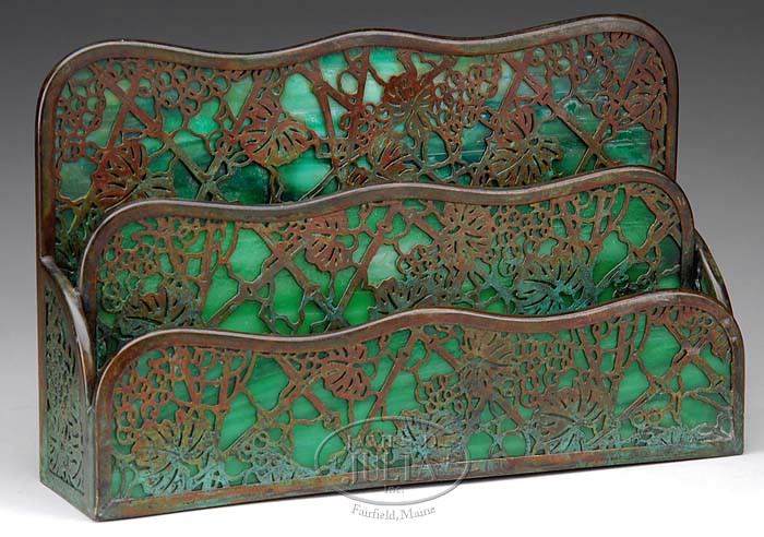 TIFFANY STUDIOS GRAPEVINE PAPER RACK. This 2-tier paper rack begins with beautiful medium to dark green striated glass overlaid with a grapevine pattern that carries a beautiful green/brown patina finish. Signed on the underside “Tiffany Studios New York 1008″. SIZE: 10″ x 6”. CONDITION: Very good to excellent with one small dent to curved side. 5-68493 (1,000-1,500)