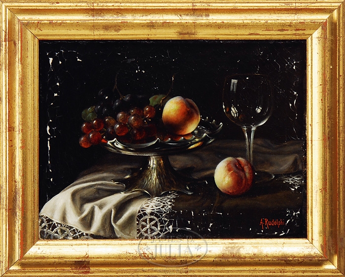 A. RUDOLPHI (European, 20th Century) REFLECTIONS. Oil on canvas still life scene shows a silver compote with multicolored grapes and peach with a clear wine glass having a reflection of the scene. A lace tablecloth and peach complete the composition. Signed lower right “A. Rudolphi”. Housed in a gilt molded wood frame. SIZE: 12″ x 16″. PROVENANCE: The Estate of Joan B. Hanson, Fair Haven, N.J. CONDITION: In need of restoration, lifting craquelure with losses. 9-95870 (200-300)