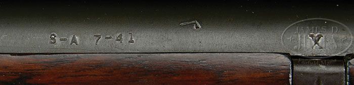 *RARE PRE-WAR SPRINGFIELD M1 GARAND RIFLE. SN 303675. Cal. .30-06. Bbl 24-1/2″. This pre-war M1 has the early slotted gas piston nut. Bbl is marked “S-A 7-41”. Rear sight adjustment wheel is marked on left side up and down with arrows with words “Battle Range” on either side of a triangular arrow. Stock is marked with proper cartouche on left side “S.A.” over “G.H.S” and also has circle “P” on pistol grip and crossed ordnance cannons on right of stock stock inspector’s cartouche. Small parts are correct and properly stamped. Firing mechanism functions smoothly when operated by hand; this weapon appears fully functional. CONDITION: Overall finish and appearance is fine with a bit of thinning to receiver,about 70% overall. Bbl and bolt have significantly more, showing about 90% a greenish-gray-blue. Bore is excellent, shiny with some darkening to the grooves. No TE/ME values available. Gas housing is mostly bright as seen on so many M1s of the era, as do the sling and stacking swivels. None of this detracts from the overall handsome appearance of this rifle. The wood stock is of a deep rich brown color. There are two 1/4″ diameter plugged holes on the left side of stock at the forward 3/4″ end of the fore plate. But this was done very professionally and can hardly be seen. There are also some dings and handling marks over the stock, which has been lightly sanded and properly refinished at some point. A very attractive and genuine “Pearl Harbor” era M1 Garand. 4-46768 JWK54 (3,000-5,000)