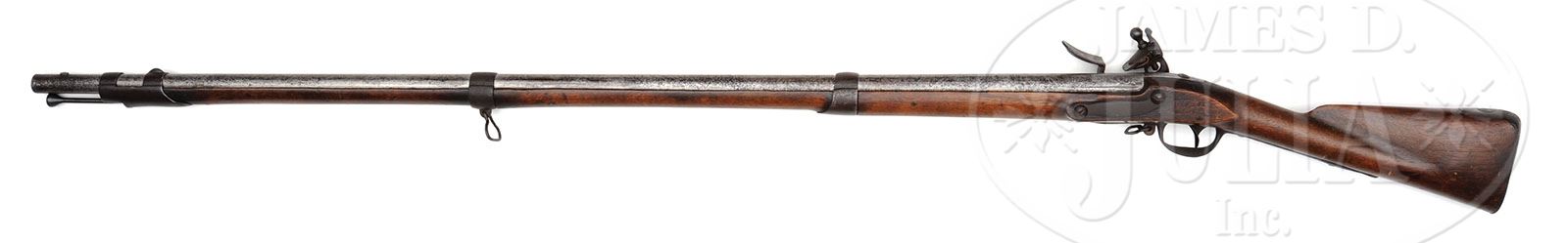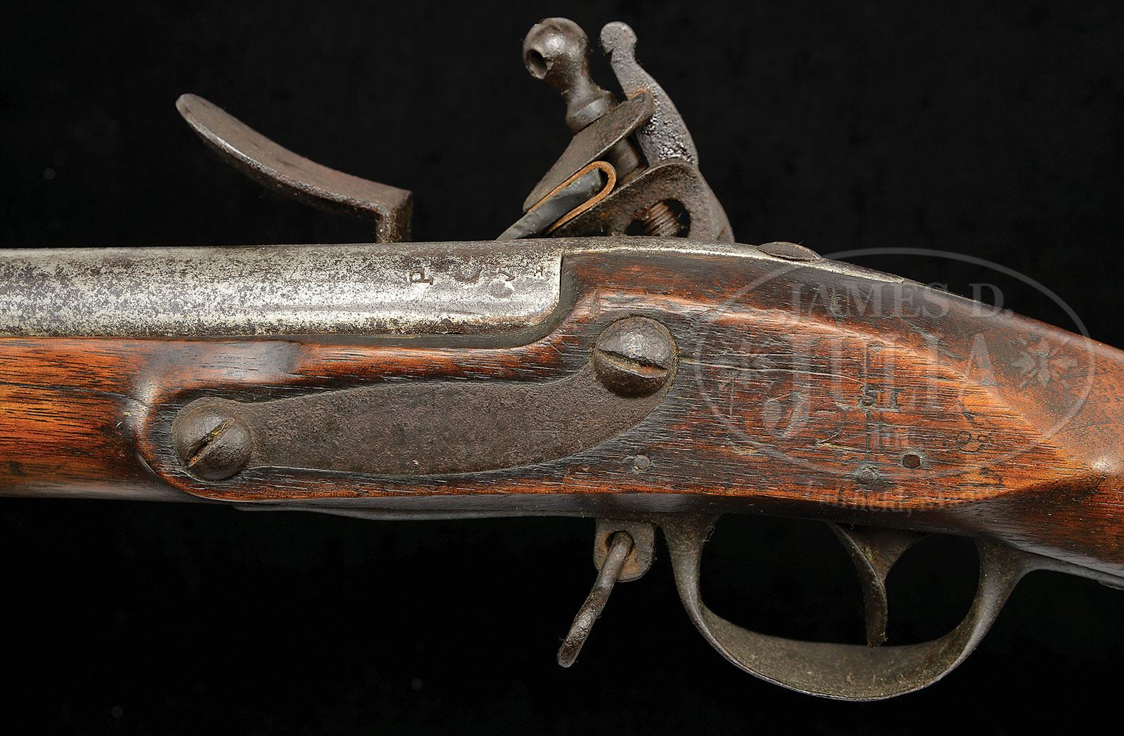 U.S. MODEL 1795 TYPE I SPRINGFIELD FLINTLOCK MUSKET. SN NSN. Cal .69 44 3/4″ bbl w/ brass blade sight on the front barrel band, with a bayonet lug on top of the muzzle and “P/V” on the left side and “US” in the center of the breech. The undated lock is marked “SPRINGFIELD” in an arc behind the hammer and “eagle/ US” below the fenced flash pan. Smooth straight grip stock with deeply fluted comb is oil finished, with “US” inspectors mark and “31” behind sideplate and 3 barrel bands, button head ramrod, Trigger guard has long pointed finials at front and back. Flat buttplate marked “08”. CONDITION: Generally very good. Lock work and appended metal parts are a pleasing even brown patina overall, showing no evidence of cleaning. Breech area is pitted. Lock markings are strong, the Eagle and “Springfield” are clearly visible. Stock is excellent retaining most of what appears to be orig finish, hand worn, a few cracks radiate from sideplate. Barrel may have been cleaned. Initials “CG” in right stock are recent. 4-49520 JWD44 (3,000-5,000)
