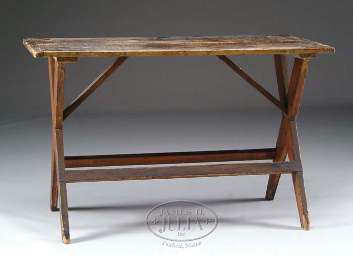 SMALL COUNTRY SAWBUCK TABLE. Two board top with breadboard ends has old blue and cream paint history underneath, cross side supports with mortised stretchers. Nice surface showing wear and use. SIZE: 29” h x 46” x 22”. CONDITION: Scrubbed top surface with one area with missing edge to wood at central crack. 8-87307 (450-600)
