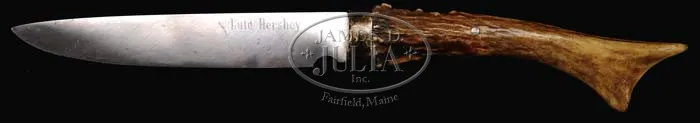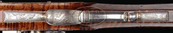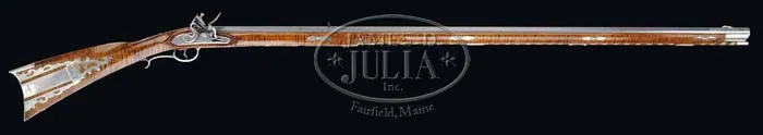 RARE & HISTORICAL NRA PRESENTATION CONTEMPORARY KENTUCKY RIFLE & ACCOUTREMENTS BY CECIL G. BROOKS OF LOWELL, OHIO, WITH MASONIC SIGNIFICANCE. SN NSN. Cal. 38. Rifled 45-1/2″ highly engraved full oct bbl, signed “C. G. BROOKS”. This rifle has all silver hardware & inlays, including the 4-pc silver patchbox with 6 piercings whose door is engraved as follows: “Traditional Flintlock Rifle presented to Lt. Gen. Lewis B. Hershey, Director Selective Service System, by the National Rifle Association of America at its 86th Annual Members Banquet, 28 March 1957”. The lock is profusely engraved as are the side plate, bbl tang, trigger guard, saddle plate, entrance ferrule, & nose cap. The rifle has 11 silver inlays. The rifle is accompanied by a scrimshawed powderhorn, an engraved bullet mold, an antler-handled knife, & a silver-mounted priming horn. The silver-mounted powderhorn is inscribed: “Presented by the National Rifle Association of America” and was presented along with the rifle. The silver-mounted priming horn is inscribed: “Lt. Gen. Lewis B. Hershey, Toledo, 1960”, which would suggest it was presented by Mr. Johnston to the general at a later date. The engraved brass bullet mold, & the antler-handled knife marked “Lute Hershey”, were added to the collection at an unknown time. Four-star general Lewis B. Hershey, director of the U.S. Selective Service, was given this presentation flintlock rifle & powderhorn by NRA president Rear Adm. Morton C. Mumma, USN Ret., as guest speaker at the annual NRA banquet Mar. 23, 1957. The presentation flintlock rifle was made by Cecil G. Brooks of Lowell, Ohio, and the powderhorn was made by LaDow Johnston of Toledo, Ohio. LaDow Johnston was the first president of the National Kentucky Rifle Association. Gen. Hershey was appointed Director of Selective Service in 1941 by President Franklin D. Roosevelt. Hershey served as Draft Director under 6 different Presidents. He played an important role in the mobilization of the home front during World War II, the evolution of Cold War policies under Truman & Eisenhower, and the decisions concerning the treatment by the military of conscientious objectors, blacks, & women, and the Vietnam Protest under Lyndon Johnson. Gen. Hershey was a Mason and Northeastern Lodge No. 210, Fremont, Indiana, who celebrated its 150th anniversary in 2007, commemorated the occasion with the issuance of a coin with the likeness of Lewis B. Hershey on one side. Hershey was a 50-year member of Lodge No. 210. The presentation powderhorn was featured on the cover of The American Rifleman in May of 1957. ¶Contemporary rifle collecting as a serious hobby began in the early 1960’s & has grown to become very popular today with its own contemporary rifle association that meets once a year in Lexington, Kentucky. Contemporary rifles are normally collected for their artistic qualities & have realized prices as high as $50,000 due to their fine workmanship. This may be the chance of a lifetime to purchase a relatively early contemporary rifle by a recognized maker, which also has important historical and masonic significance. PROVENANCE: Copy of “The American Rifleman” cover, May 1957. Consigned by a direct descendent of Gen. Hershey. CONDITION: Entirely like new condition throughout. 4-35569 RGG15 (12,000-20,000)