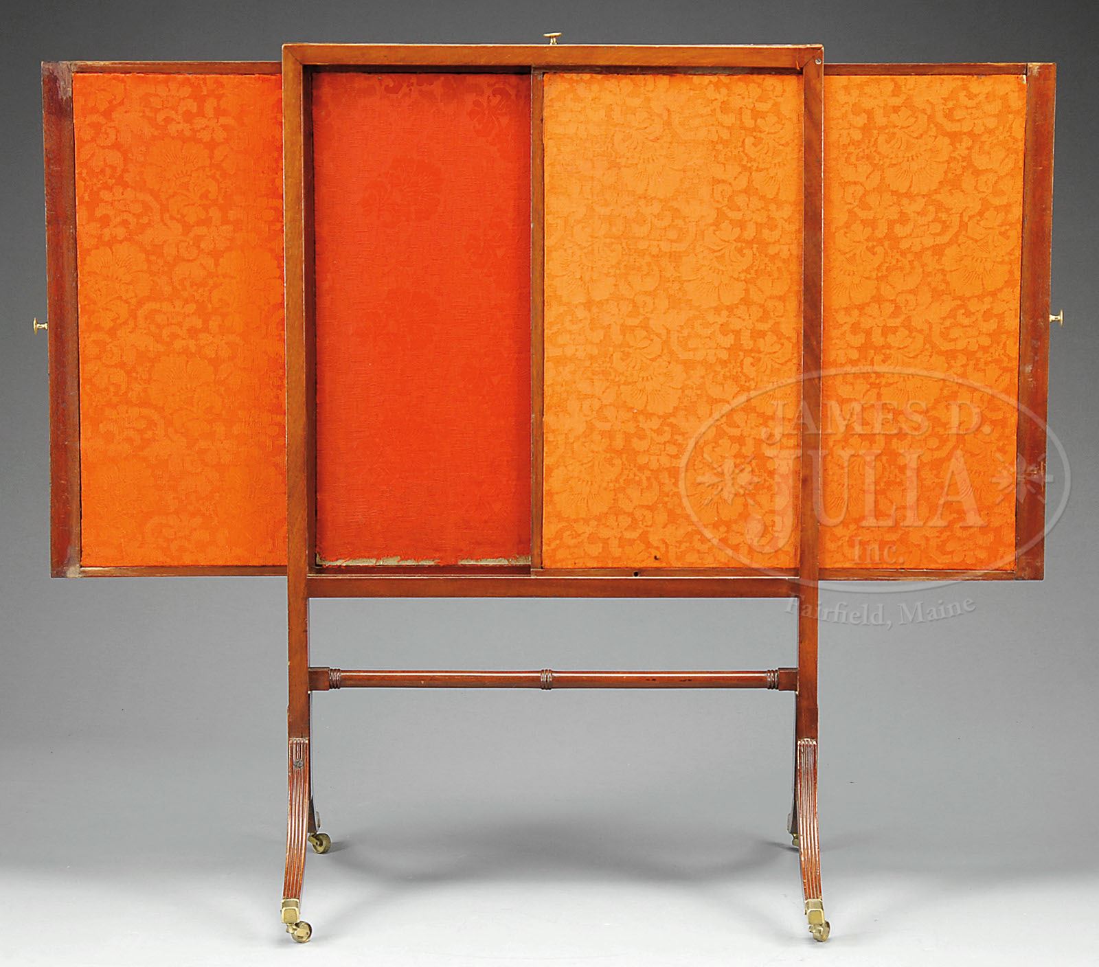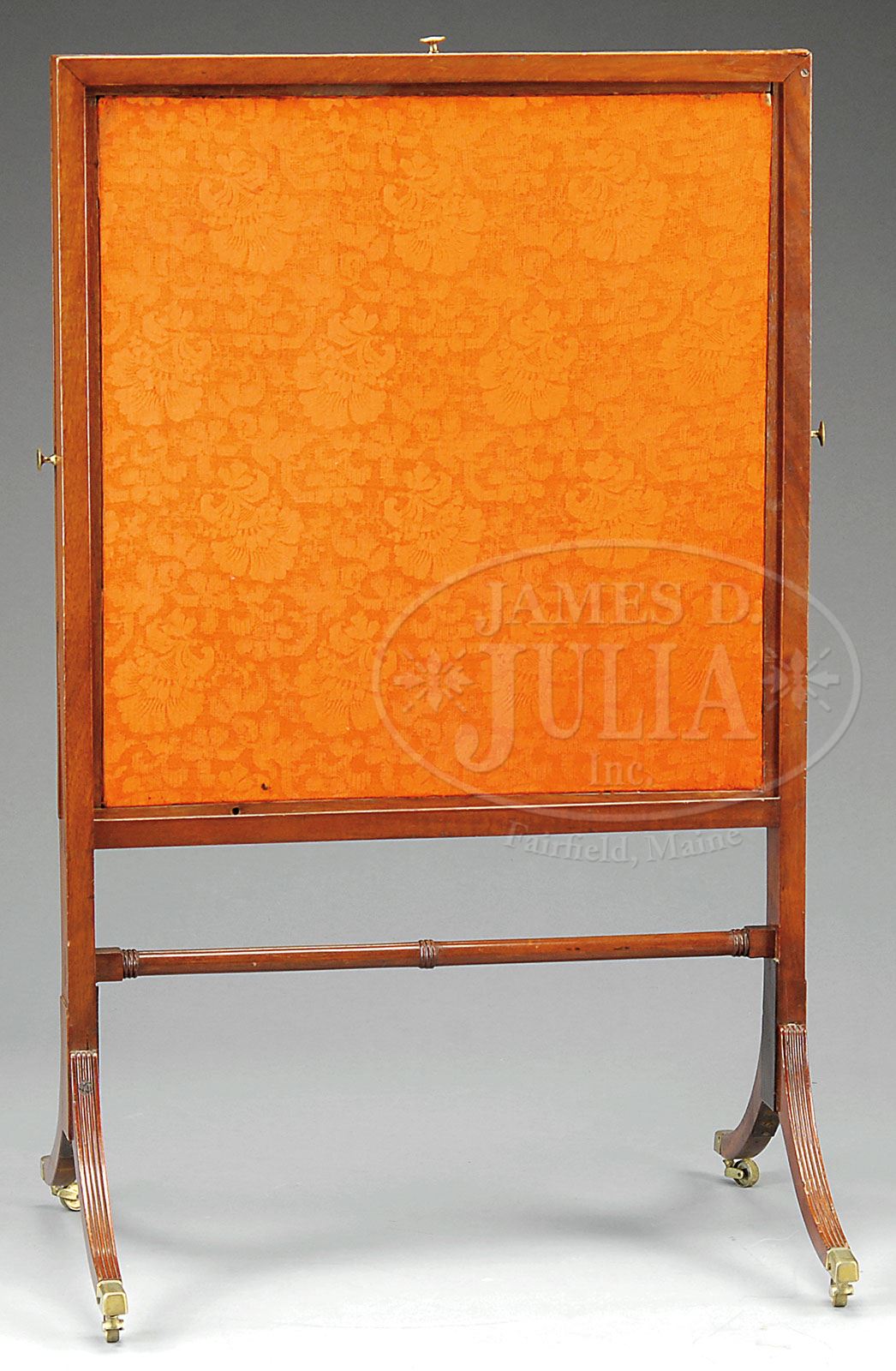 HEPPLEWHITE MAHOGANY ADJUSTABLE FIRE SCREEN. Circa 1810. The rectangular frame fitted with two sliding horizontal frames centering a third frame, all covered in a red floral silk brocade raised on a trestle base with out-swept square tapered legs terminating in brass capped casters. SIZE: 44″ h (closed) x 27″ w (closed) x 20″ d. CONDITION: With original polished and cleaned surfaces. Proper upper left corner of master frame with repaired damage. Otherwise very good. 9-20228 (200-300)