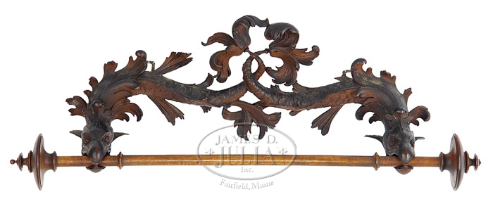 FANCIFUL AUSTRIAN CARVED TOWEL RAIL, CIRCA 1896. Signed “Storm” in script on reverse and dated 1896, the carved walnut towel rail depicting two opposing fanciful serpents or birds grasping a turned rod, their tails intertwined, all heavily and finely carved. SIZE: 10-1/2″ h. x 35″ overall l. x 7-3/4″ d. CONDITION: In fine original condition with detailed carving intact but with small old repairs to scrolled mane. Nice old patina. 5-67250 (800-1,200)