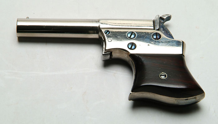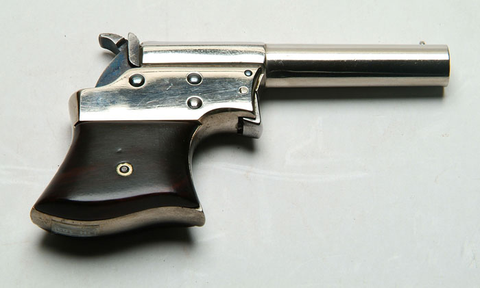 RARE REMINGTON VEST POCKET PISTOL. Cal. 30 RF. SN 363. Nickeled brass frame, 3-1/2” part oct bbl, brass post front sight, & 2-pc smooth rosewood grips. Marked “REMINGTON’S ILION, Nxx / PATD OCT. 1.1861.NOV.15.186x” on the top flat of bbl. The end of both lines run into rear side and did not strike properly. One of the estimated quantity of 500 produced. CONDITION: Retains most of the recently polished nickel with bright blue on screws & operating parts. Repaired chip out of right grip. Bore is moderately pitted. Action is fine. 4-59344 JH108 (800-1,500)