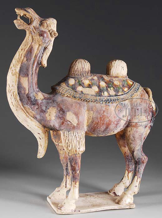 PARTIALLY GLAZED EARTHENWARE FIGURE OF A CAMEL. In the style of the Ming Dynasty, China. The mottled glaze in greens and browns. THe camel depicted with upraised head and open mouth and is shown with a fabric saddle over the two humps. SIZE: 23-1/4″ h x 17-1/2″ l. CONDITION: The glazed surfaces with losses throughout. Caked in clay. 9-98263 (1,200-2,000)