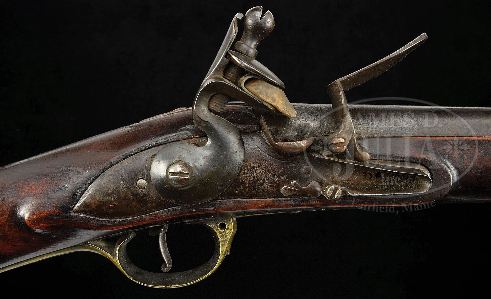 AMERICAN ASSEMBLED MUSKET. SN NSN. .79 Cal. x 41″ long bbl showing remnants of Ordnance View and Proof marks near breech. Bayonet lug set back 1″ from muzzle. 7″ long Pattern 1730 lock marked with British Ordnance Crown / “GR” and broad arrow under the unbridled pan. Behind the cock reading vertically in two lines are remnants of “TOWER / 1727”. Brass furniture consisting of nose cap, 3 rammer pipes, trigger guard, simple 1-step buttplate tang and Long Land Pattern sideplate. Trigger guard has hole for sling swivel however forestock does not, rammrod possibly the orig. Stock measures 53-1/4″ long and is void of marks. PROVENANCE: Collection of Dr. Douglas Sirkin. CONDITION: Bbl and lock have a dark patina with some moderate pitting around touch hold area and associated lock components. Brass furniture shows its age very well, as does the stock, having no major wood losses other than a 1/2″ wide by 1/4″ chip behind bbl tang. 4-49761 PAS23 (3,000-5,000)