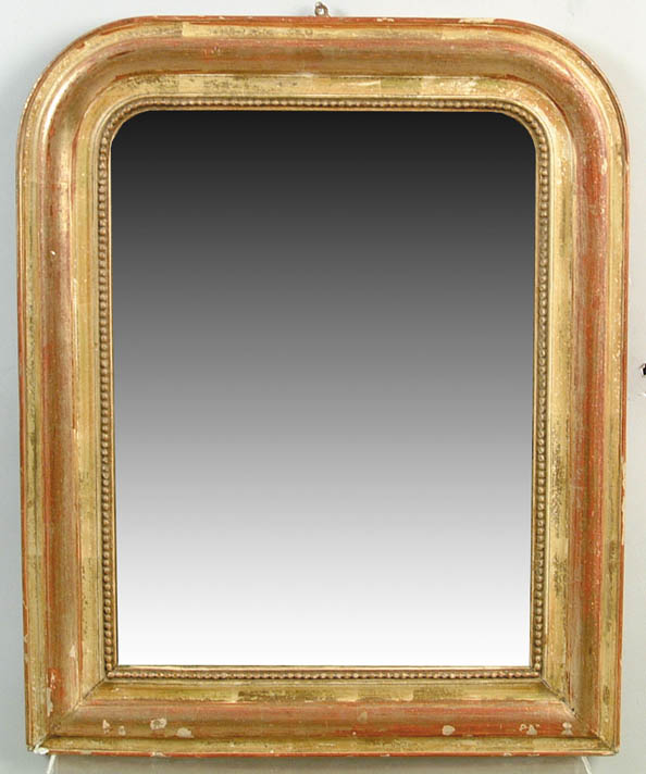 FRENCH ANTIQUE GILT MIRROR. Rounded corner top with square base having bead edge decoration. SIZE: 25” h x 20-1/2” w. CONDITION: Good. 9-95239 (200-400)