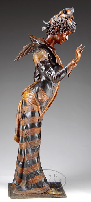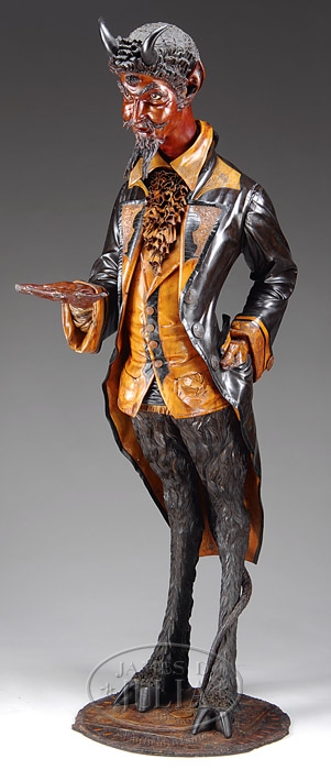 PAIR OF FINE VENETIAN CARVED AND EBONIZED FIGURES OF THE DEVIL AND HIS CONSORT. Late 19th century. Having carved signature “F. Toso, Venezia” on the proper left waistcoat pocket of the male figure. Comprised of various woods including yew, pitch-pine, and maple, each finely carved figure with alternating natural and ebonized surfaces. The devil depicted standing in tails, waistcoat, and ruffled cravat, right webbed hand outstretched, left hand in pocket, depicted with horned brow, mustache and forked goatee, having goat legs, cloven hoofs, and long tail. His consort with striped bonnet, high-collared fitted jacket, and similarly striped long dress and pointed slippers, the figure with winged shoulders, upraised right hand, the left arm at her side, her hand with extended forefinger pointing downward. Each life-sized figure depicted staring at the viewer with malevolent carved ivory eyes. Each mounted on a carved Oriental-style mat densely covered with symbols and devices. We believe that these figures were included in a Paris Exhibition in the late 19th Century. SIZE: First: 67-1/2″ h. Second: 69″ h. PROVENANCE: From the collection of the Fuller Museum of Art, Brockton, Massachusetts. Museum records show that Massachusetts governor Oliver Ames (1831-1895) purchased the figures in Europe in the 19th century. The figures remained in the Ames family until they were placed on long-term loan to the Fuller Museum in 1975, and then given to the museum in 1979, subsequently de-accessioned. CONDITION: The figures retain original surfaces with fine old patina and warm polychrome tones. There are minor professional repairs. These figures in fine condition with superior carvings. 9-92713 (60,000-90,000)