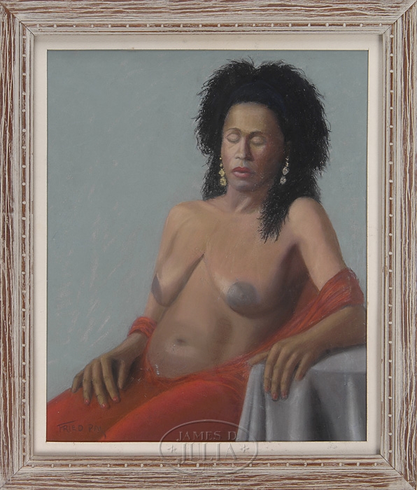 FRIED PAL (American/Hungarian, 1893-1976) NUDE WITH RED SHAWL. Pastel on paper, three-quarter portrait of a nude woman with a red drape over lower part of body. Arm rests on a linen covered table and her eyes are closed. Signed lower left. Housed in a white highlighted carved wood frame with white matte and anti-glare glass. SIZE: 22” x 18”. CONDITION: Very good. 9-95792 (600-800)